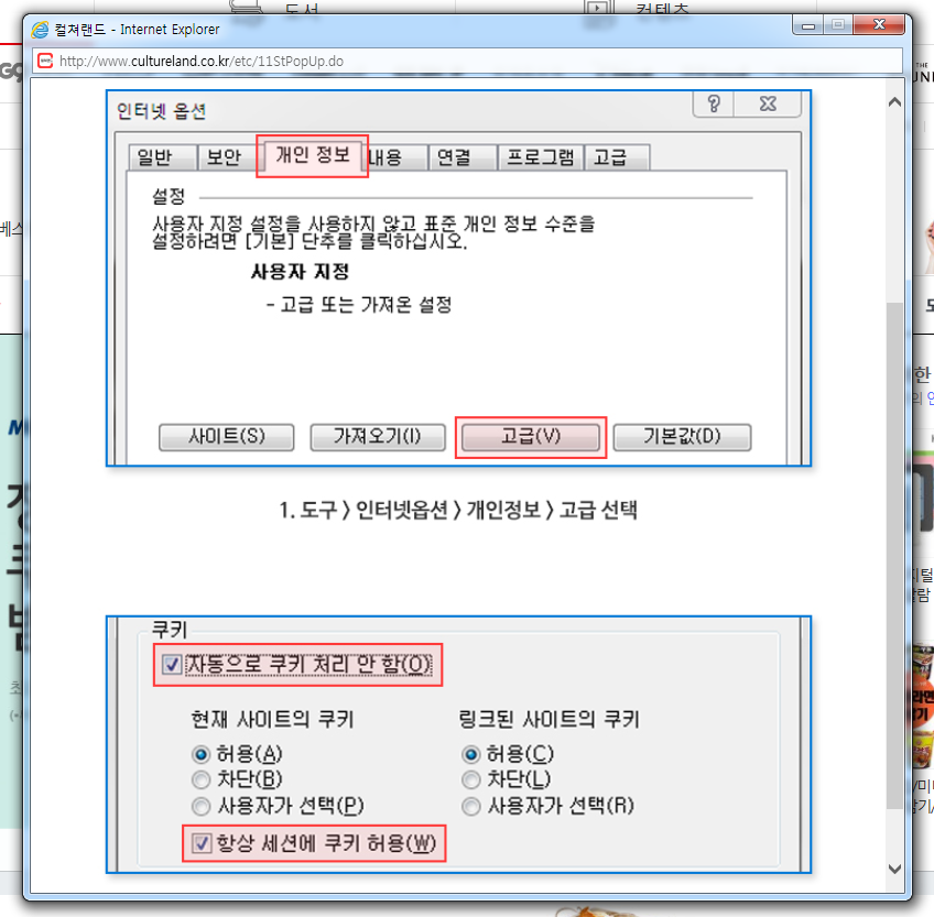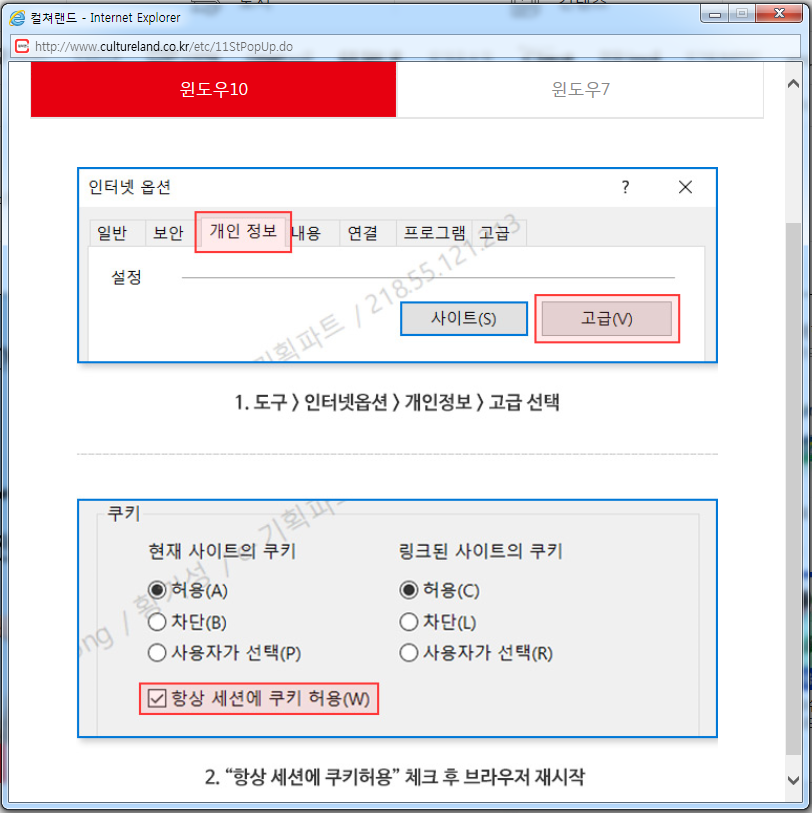 '윈도우 10'의 경우에는 '도구 > 인터넷옵션 > 개인정보'로 들어가 '고급'을 선택하시고, '쿠키'에서는 '항상 세션에 쿠키 허용'에 체크를 해줍니다.