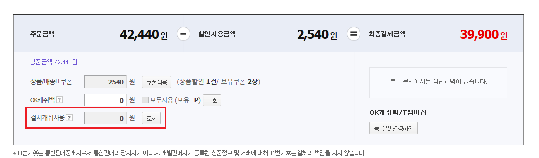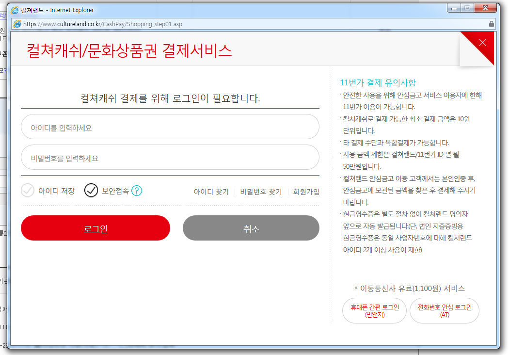단지 컬쳐랜드 내에서 11번가로 접속했다고 해서 결제수단 목록에 컬쳐캐쉬 결제 수단이 뜨지는 않습니다.