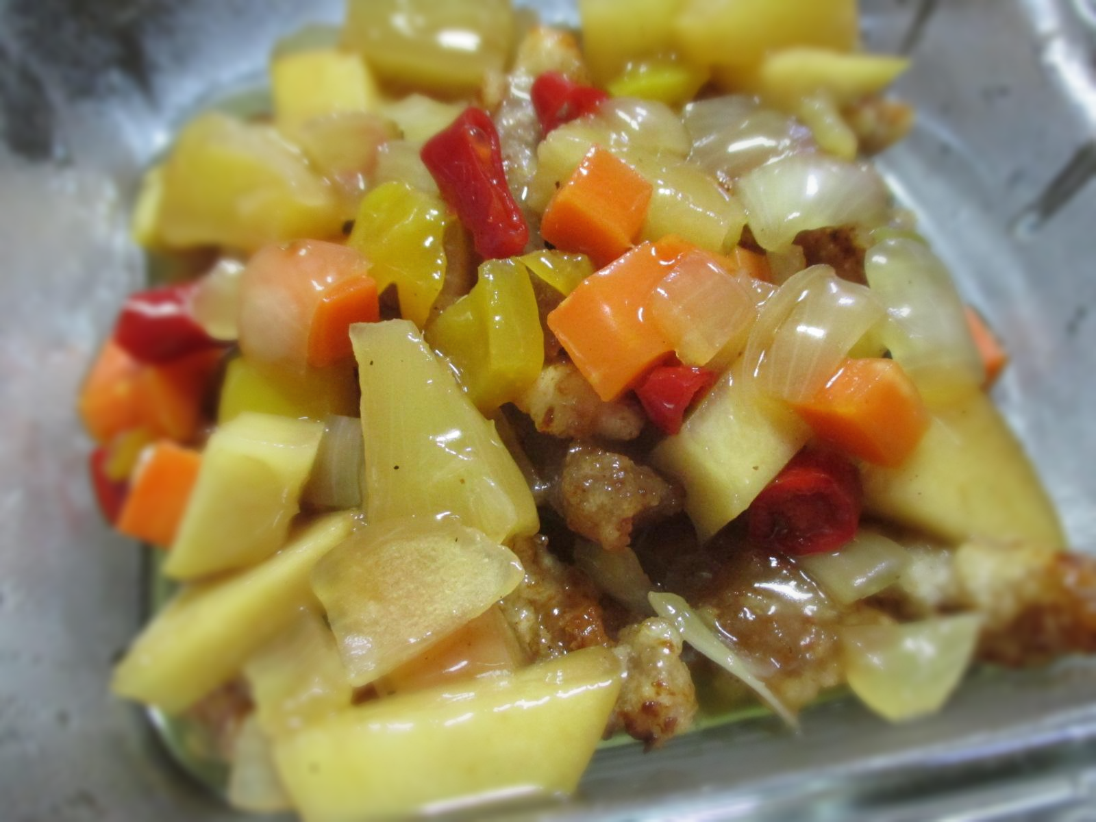 적당량의 물에 준비한 야채와 과일들 중 오래 익혀야 할 것부터 차례로 넣어가며 끓인 다음 감자 전분가루로 걸쭉하게 농도를 맞춥니다. 그리고 간장, 식초, 설탕으로 기호에 따라 간을 맞추시면 돼요.