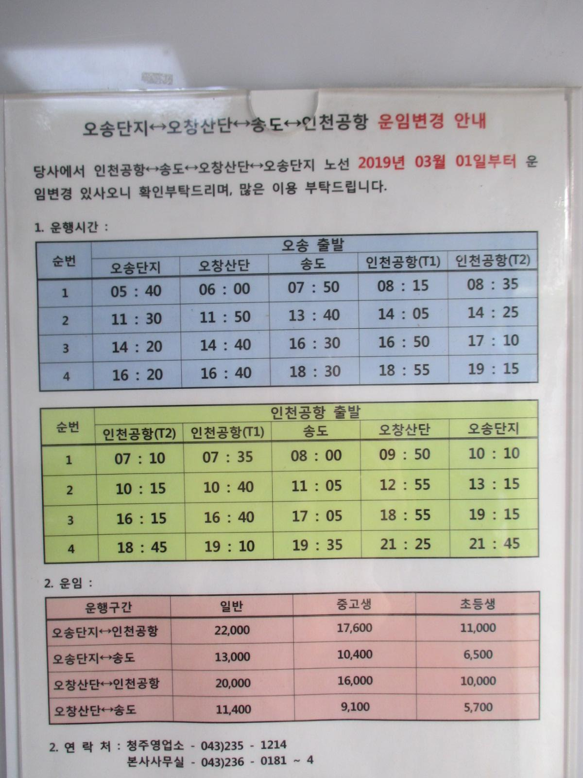 오송단지↔오창산단↔송도↔인천공항 간 운행 시간표와 운임료는 위와 같다.