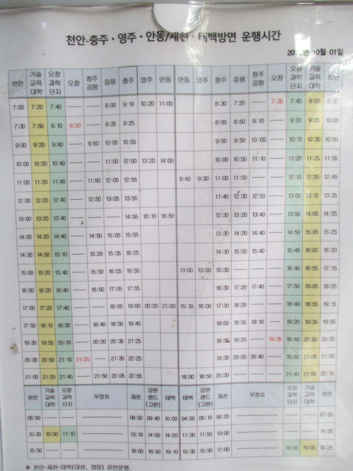 안동→영주→충주→증평→청주공항→오창→오창과학단지→기술교육대학→천안과 태백→강원랜드(고한)→제천→오창과학단지→기술교육대학→천안운행 시간표는 위와 같다.