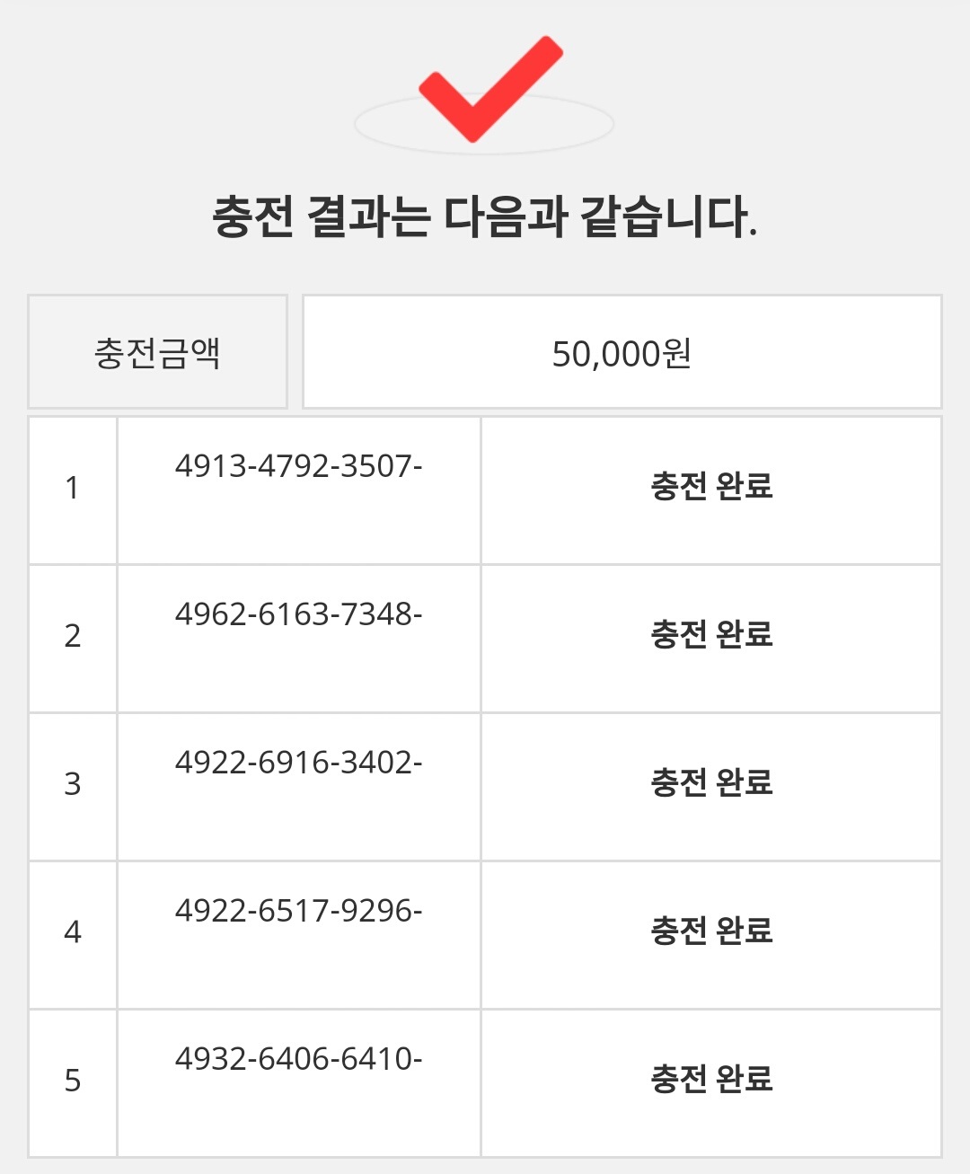 이것으로 문화상품권 충전을 모두 마쳤습니다.