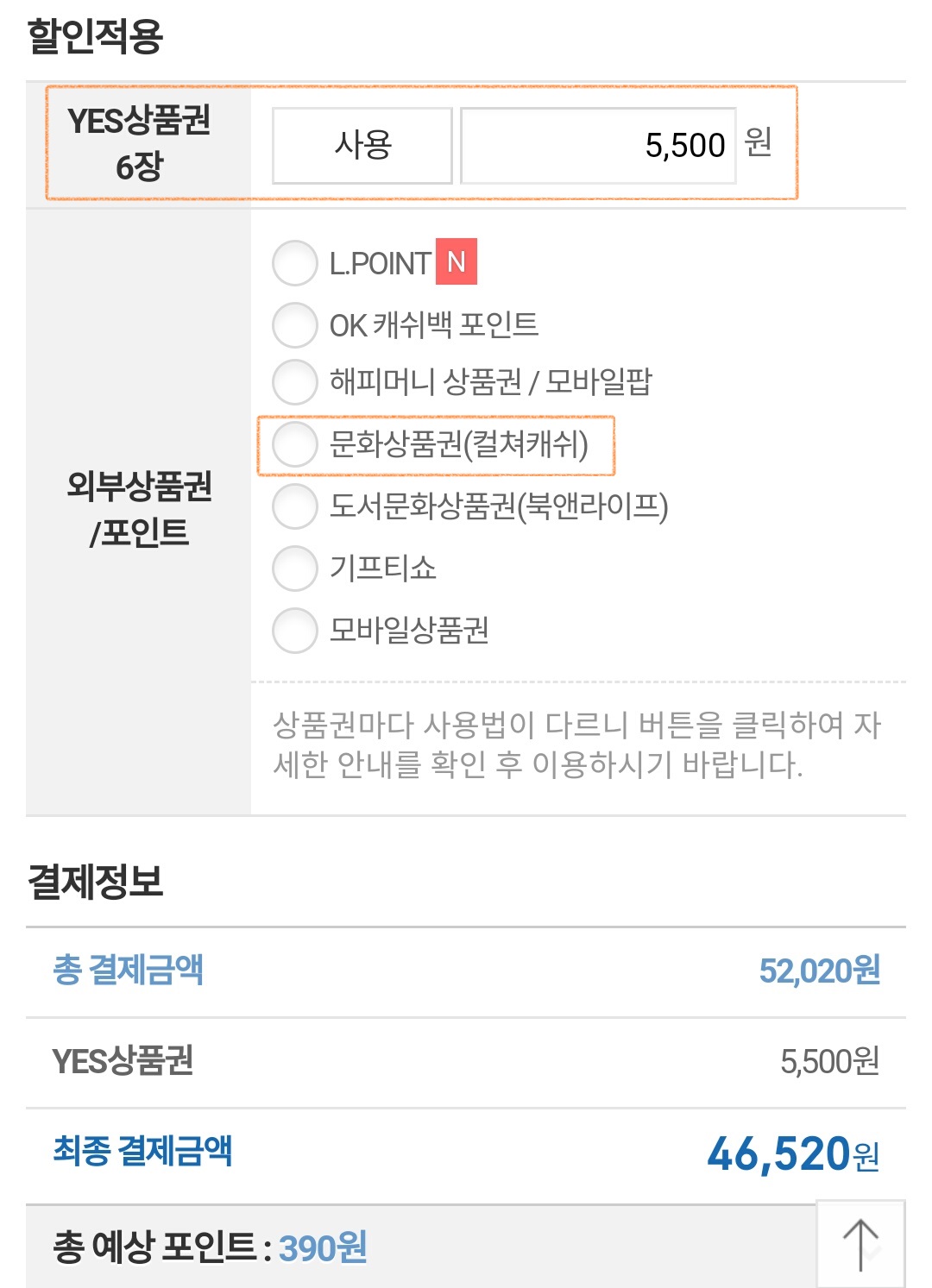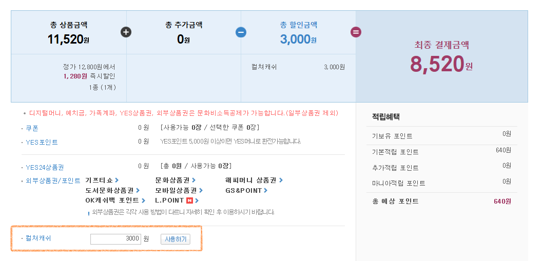 위에서 보시면 컬쳐랜드를 통해 예스24로 이동해야만 결제 페이지에서 하단에 박스로 친 항목이 나타나요. 그렇지 않고 예스24로 바로 접속하면 나타나지 않아요.