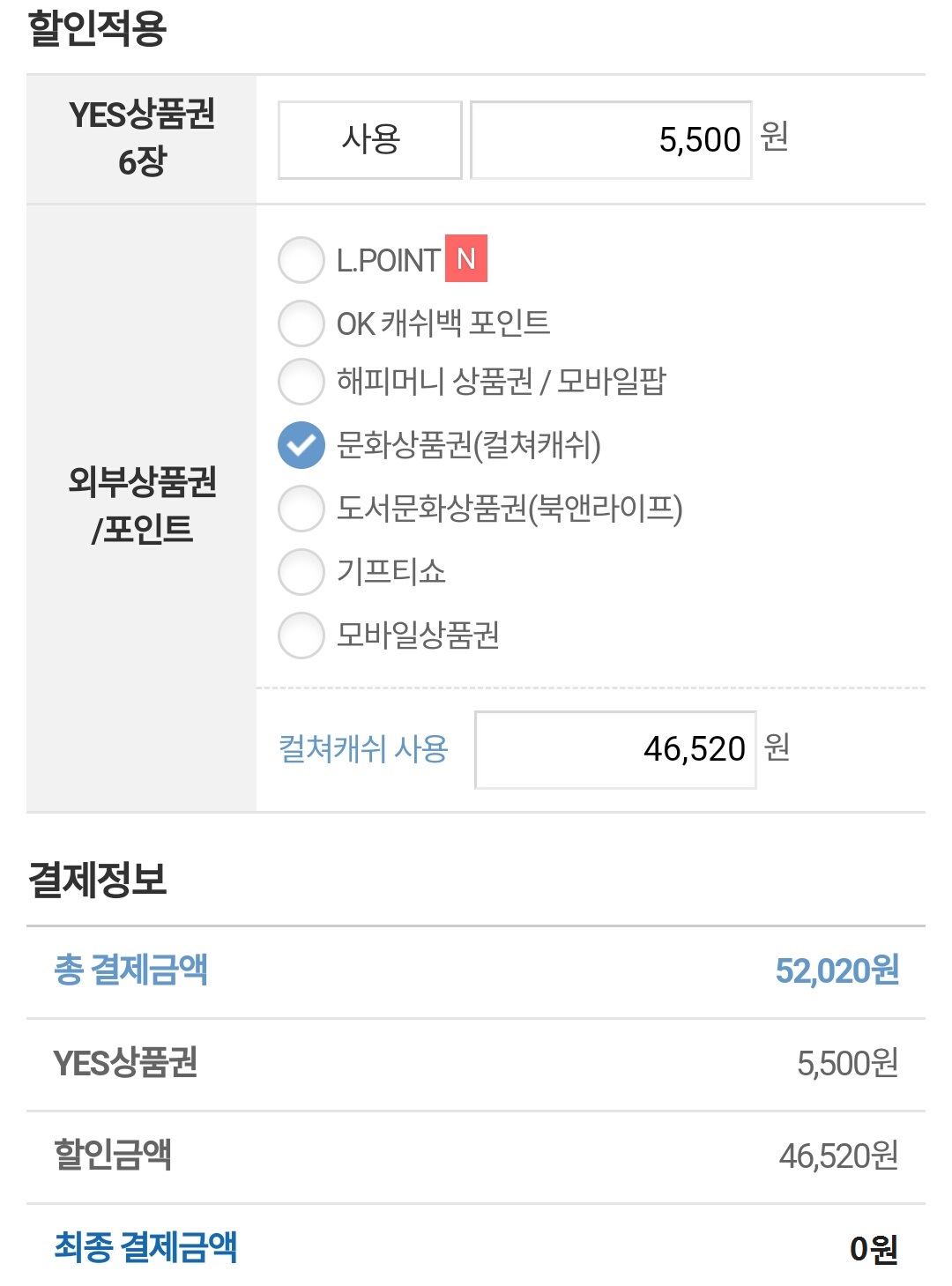 저는 켤쳐캐쉬로 모두 지불하여 최종 결제금액이 0원이 되었네요~^^