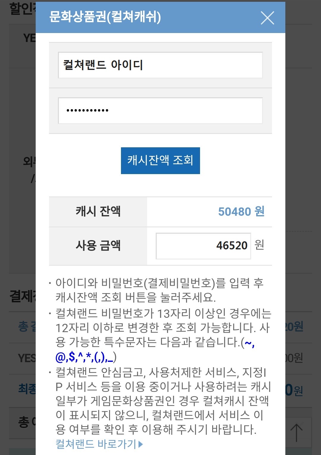 '외부상품권/포인트'에서 '문화상품권(컬쳐캐쉬)'를 클릭, 컬쳐랜드 아이디와 비밀번호를 입력한 뒤 '캐시잔액 조회'를 누르시면 보유하고 있는 컬쳐캐쉬 잔액이 뜹니다.