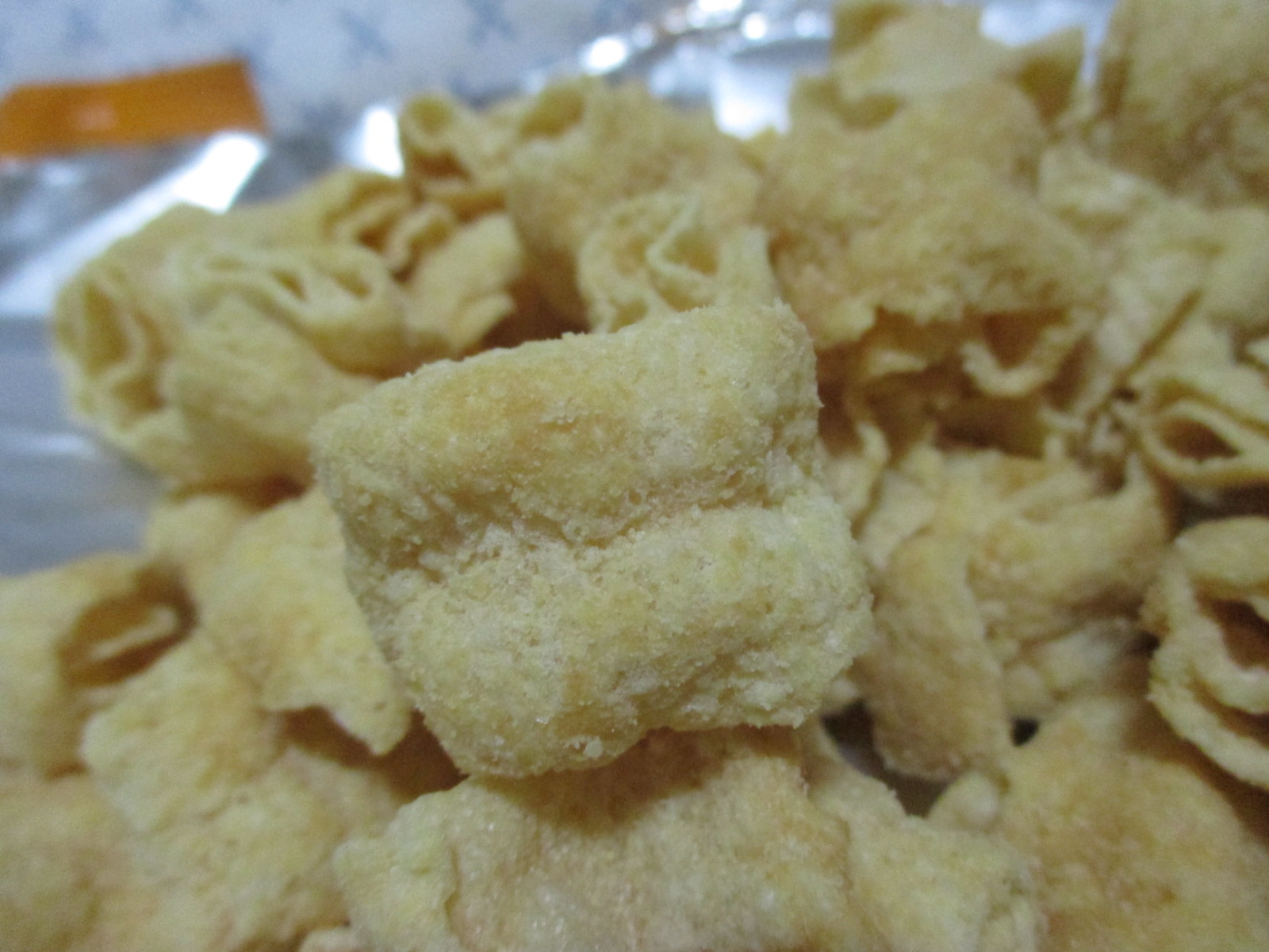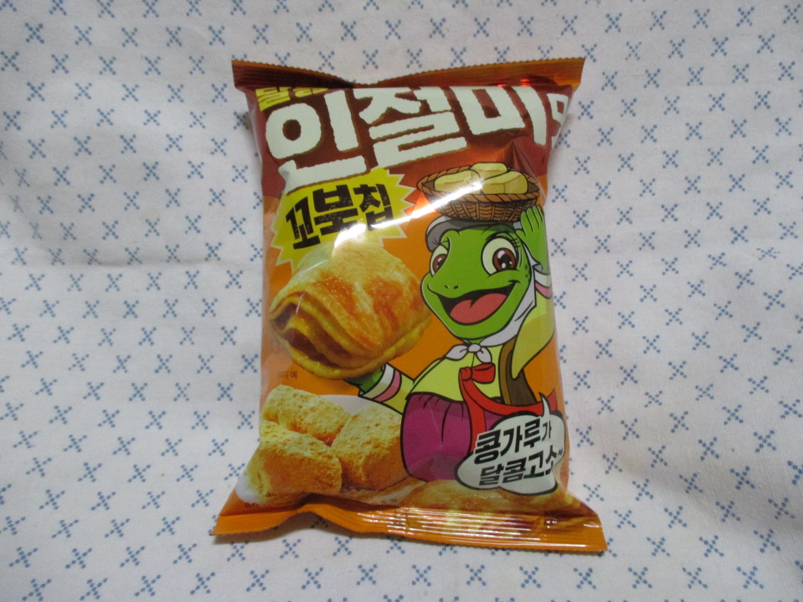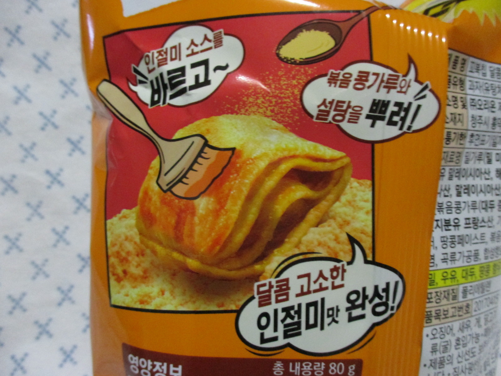 꼬북칩 인절미맛은 인절미 소스를 바르고, 볶음 콩가루와 설탕을 뿌려 완성되었단다.