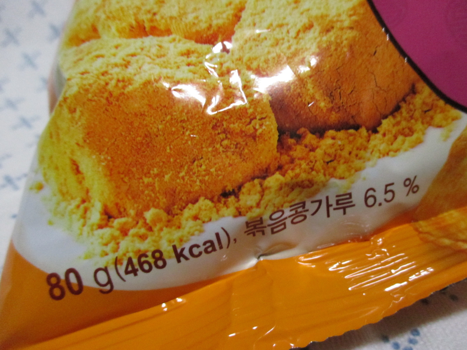 중량과 열량은 80g에 468kcal이고, 볶음콩가루가 65% 함유되었다.