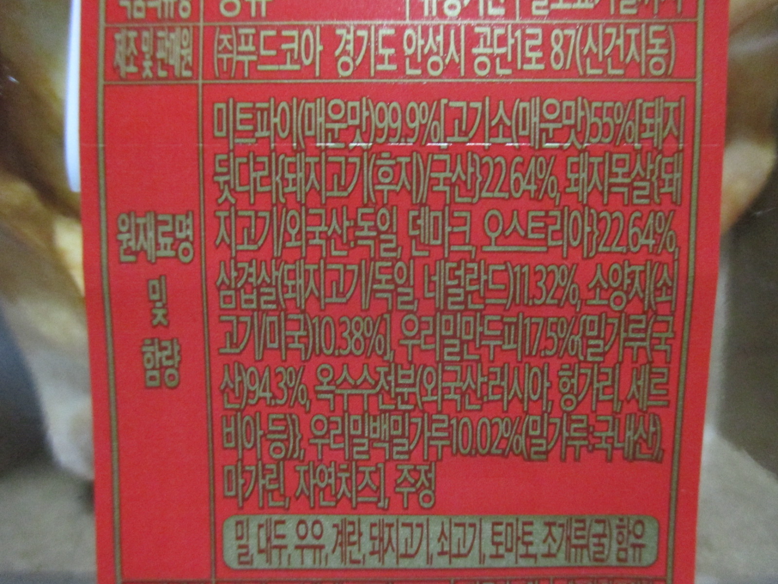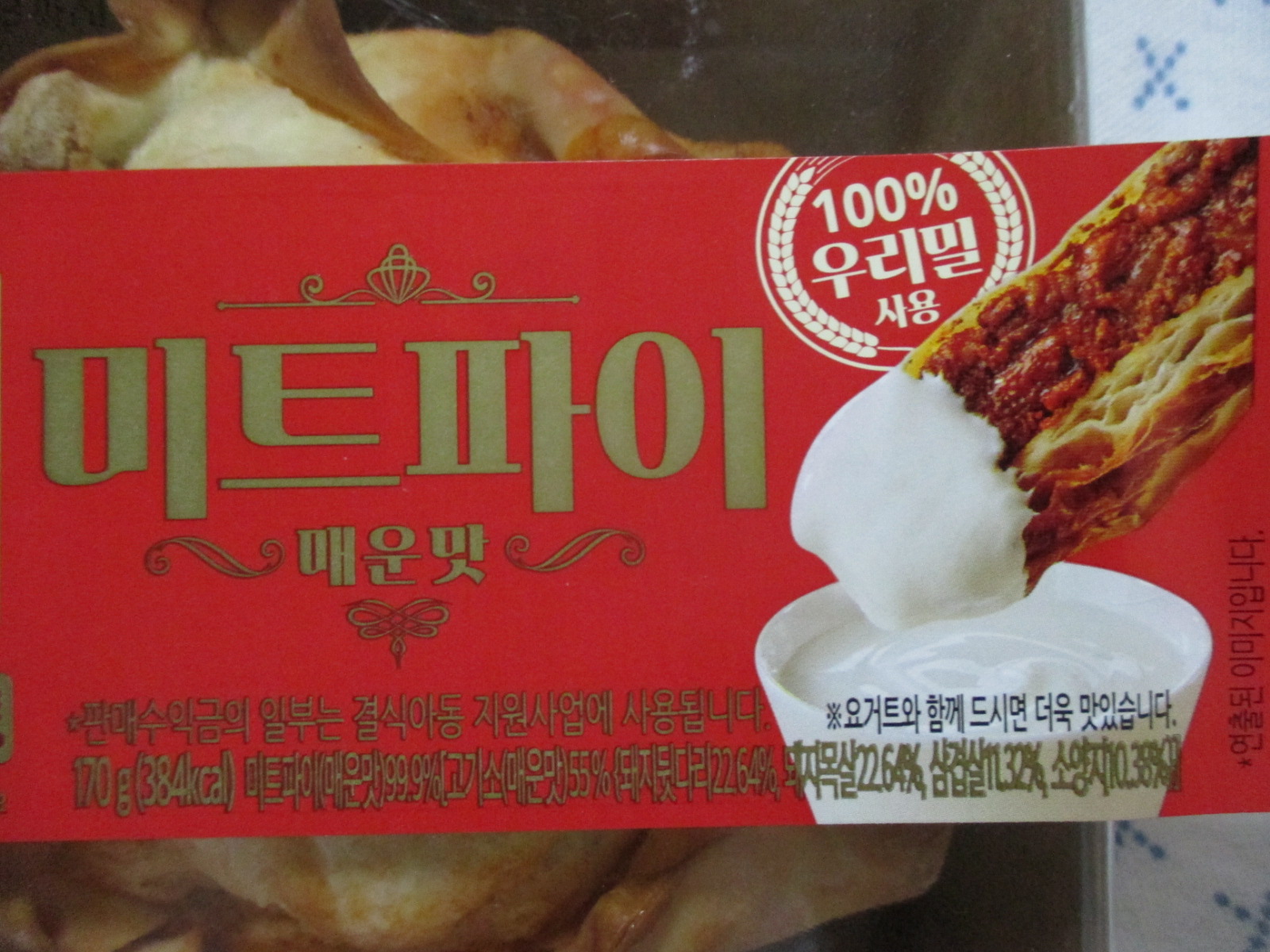 미트파이 매운맛의 총중량과 열량은 170g에 384kcal이고, 100% 우리밀과 돼지뒷다리 22.64%, 돼지목살 22.64%, 삼겹살 11.32%, 소양지 10.38%등이 함유되었다.