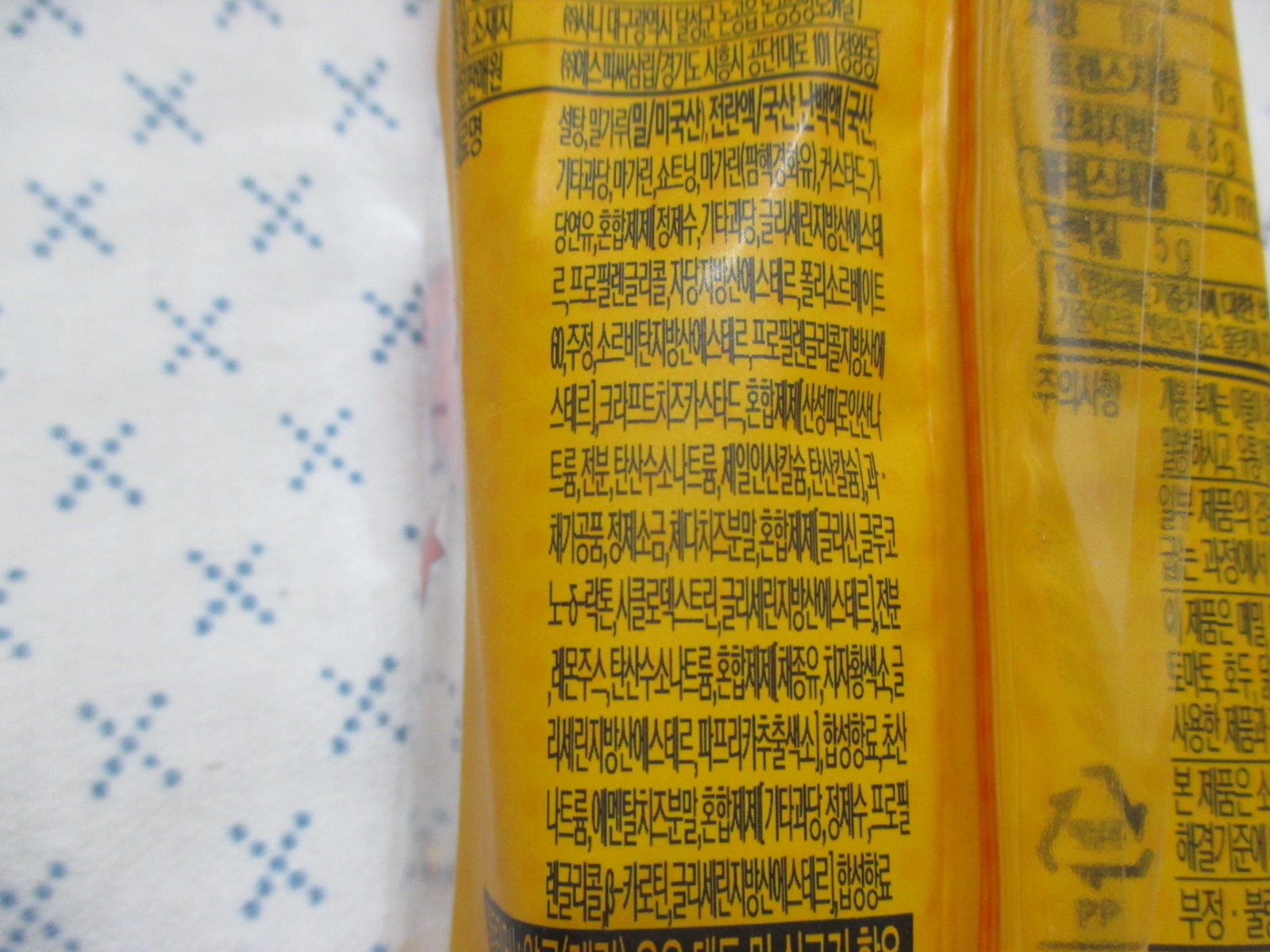 그중 첫 번째로 맛본 건 '치즈얌얌롤케익'으로 총 중량과 열량은 85g에 266kcal이고, 크라프트치즈카스타드 0.96%, 체다치즈분말 0.19%, 에멘탈치즈분말 0.02%가 함유되었다.