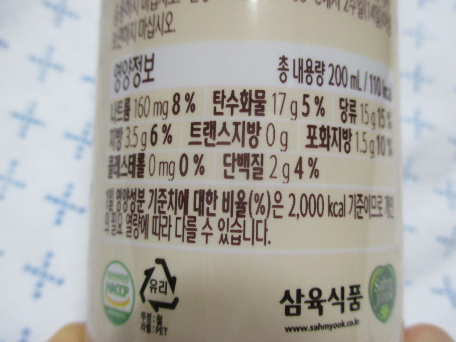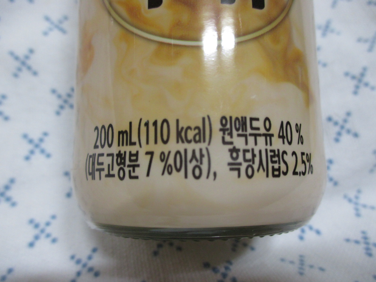 총 용량과 열량은 200ml에 110kcal이고, 원액두유 40%(대두고형분 7%이상), 흑당시럽S 2.5%가 함유되었어요.