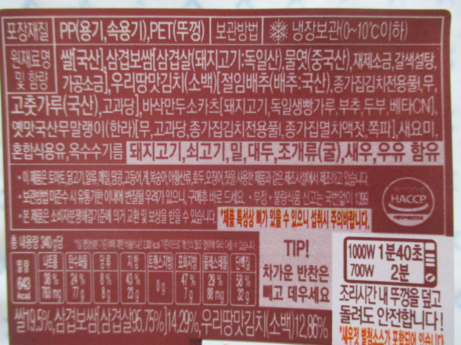 보다 자세한 영양정보와 원재료명은 위 이미지를 참고하시구요, 전자레인지 조리시간은 1000W에서는 1분 40초, 700W에서는 2분 돌리시면 됩니다.