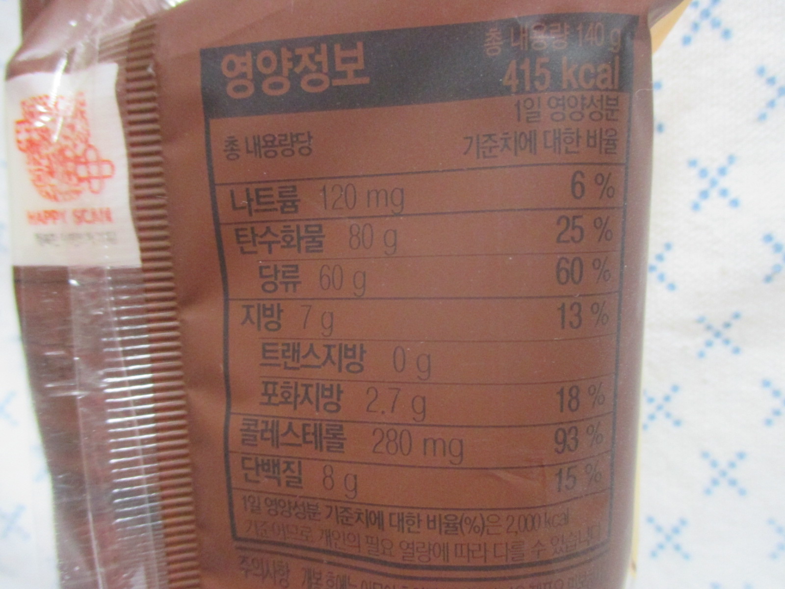중량과 열량은 140g에 415kcal이고, 사양벌꿀 0.73%가 함유되었으며, 가격은 2,300원이다.