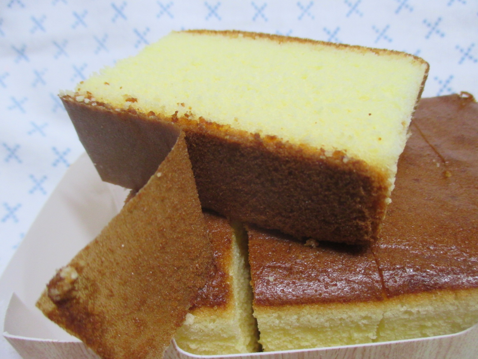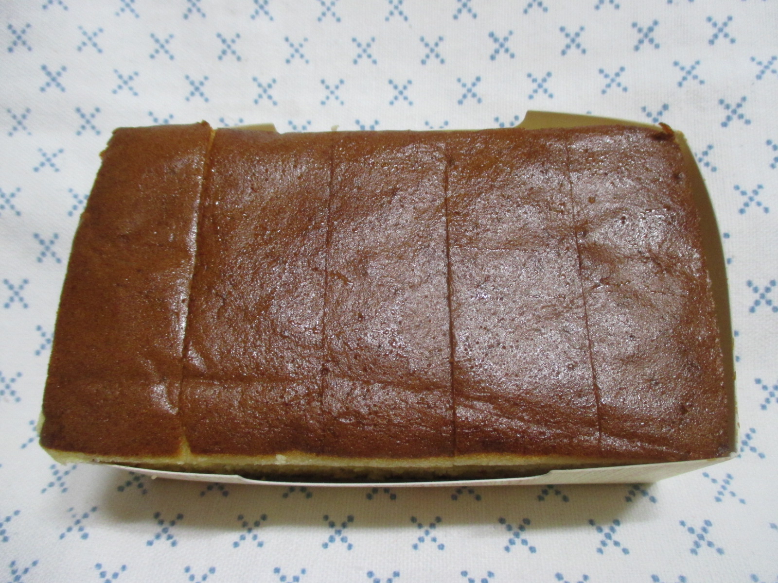 카스테라는 먹기 좋게 5조각으로 나뉘어 있고, 종이 받침에 들어 있다.