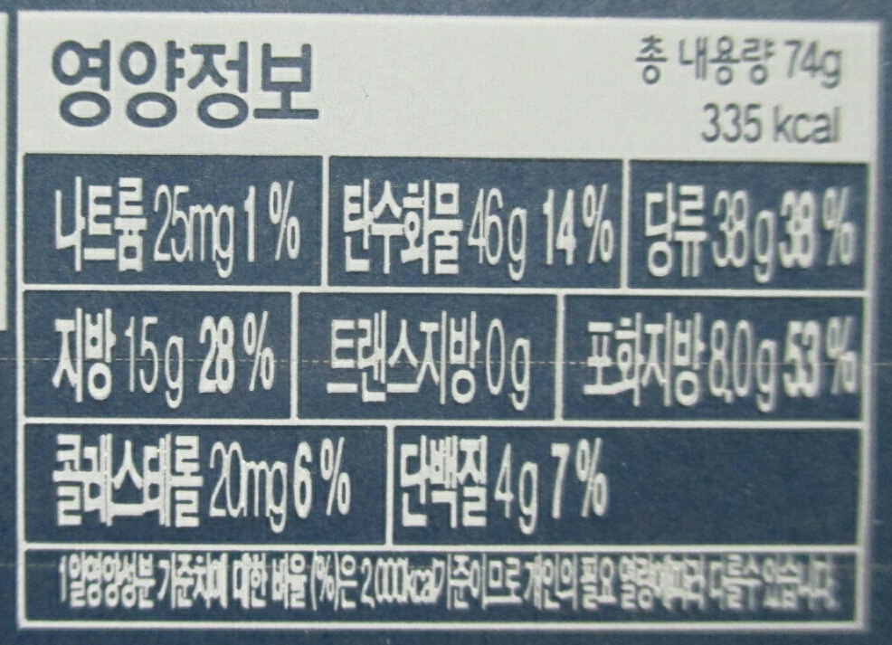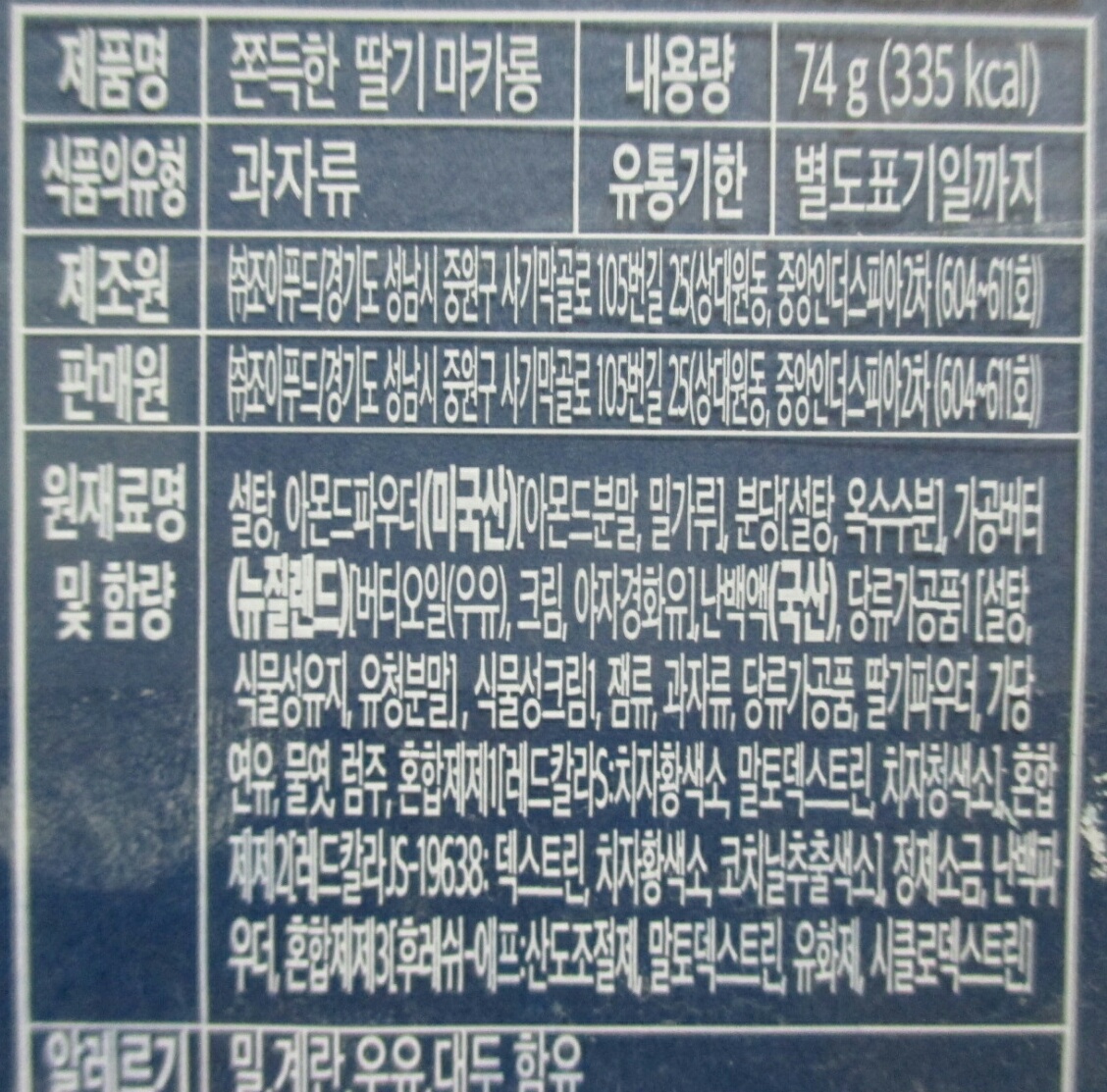 '쫀득한 딸기 마카롱'의 총 중량과 열량은 74g에 335kcal로, 보다 자세한 영양정보는 위 이미지 참고 바람요.