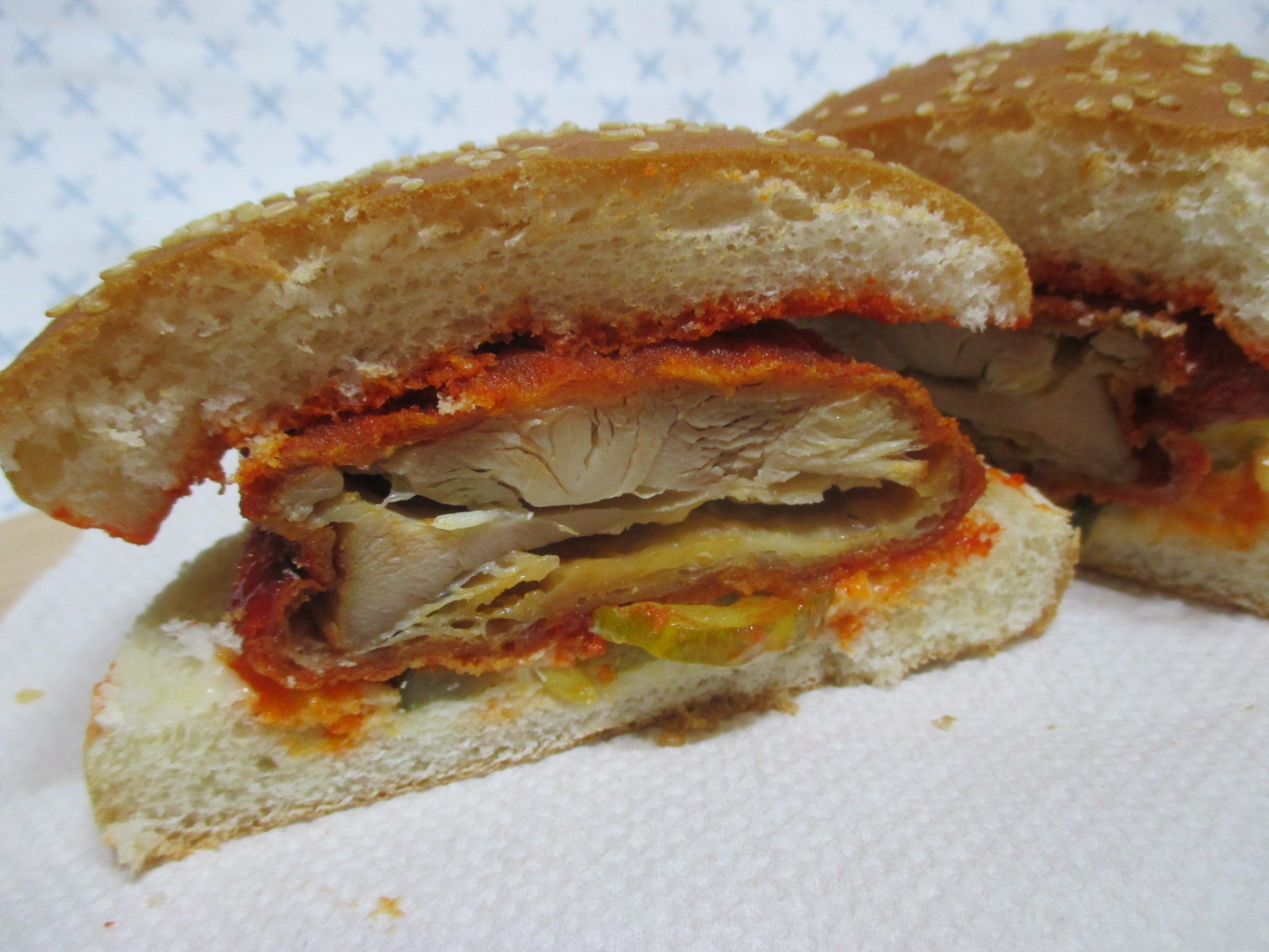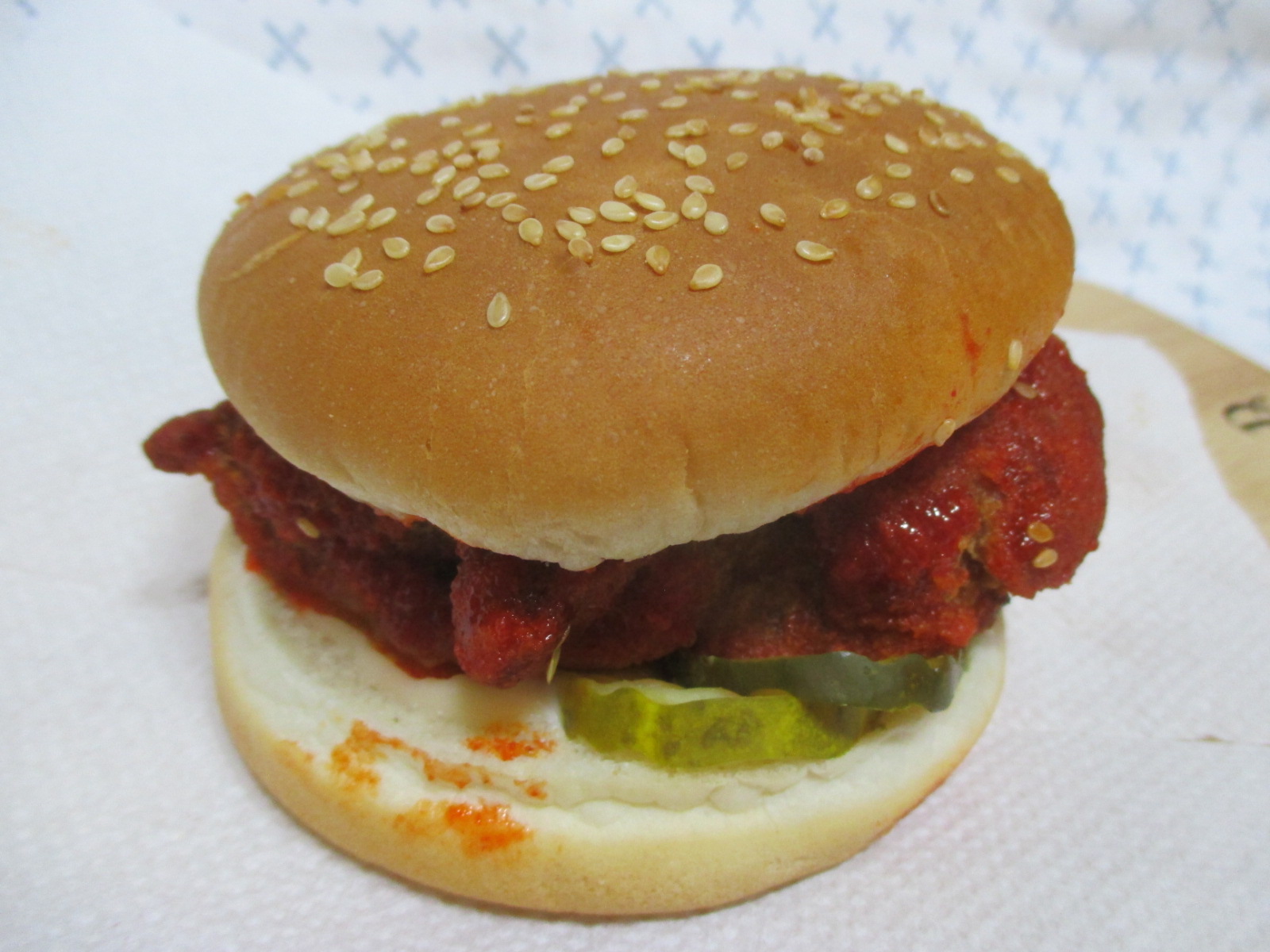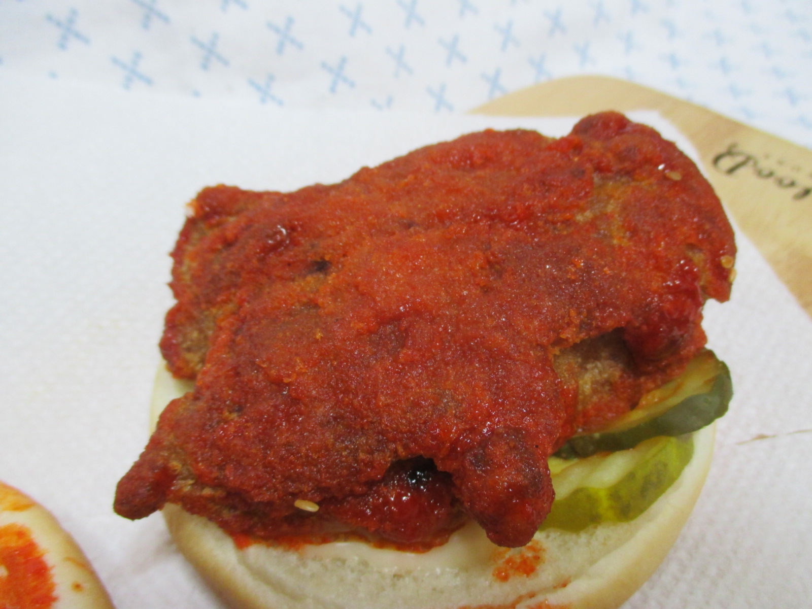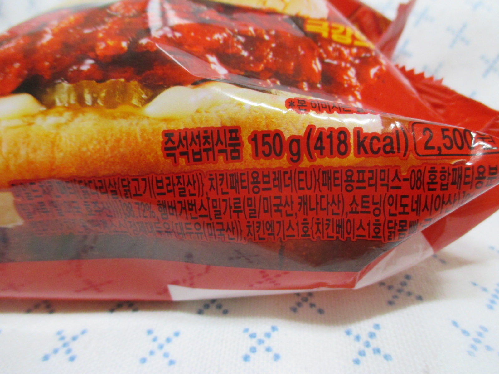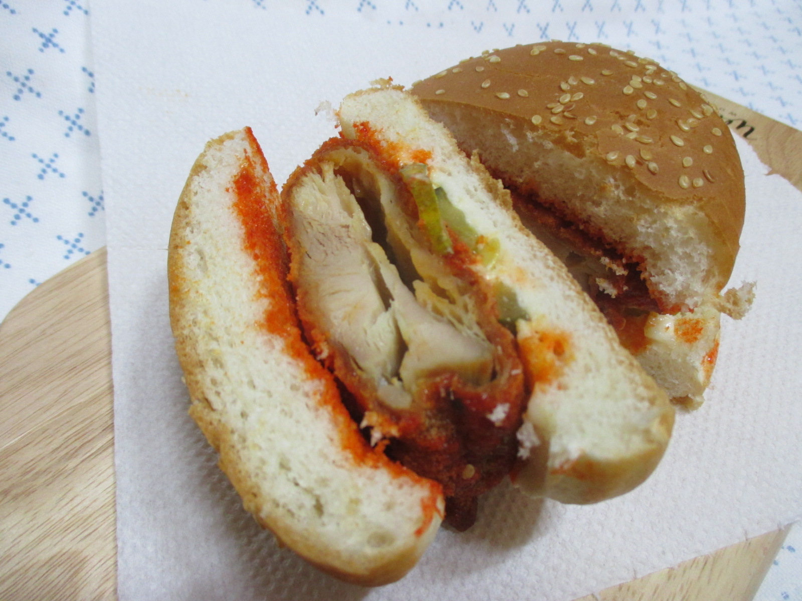 치킨 패티에 묻은 양념의 색이 매우 강렬한!