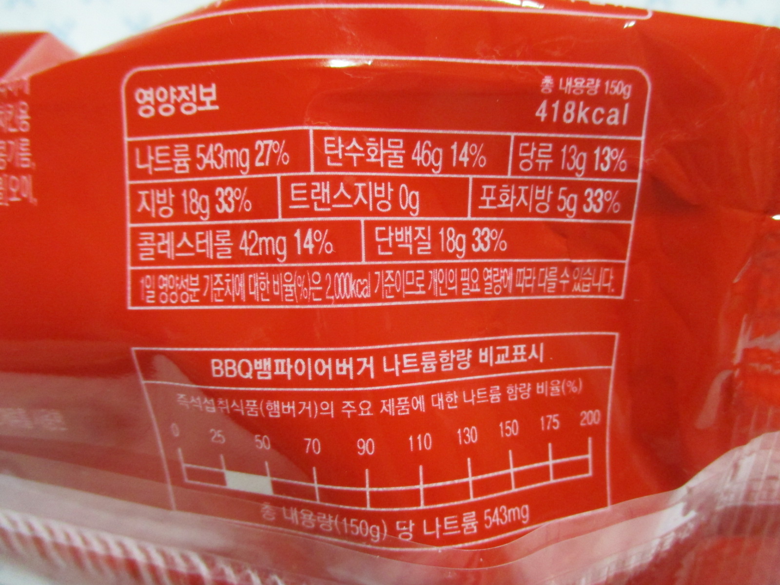 총 중량과 열량은 150g에 418kcal이고, 가격은 2,500원이다.