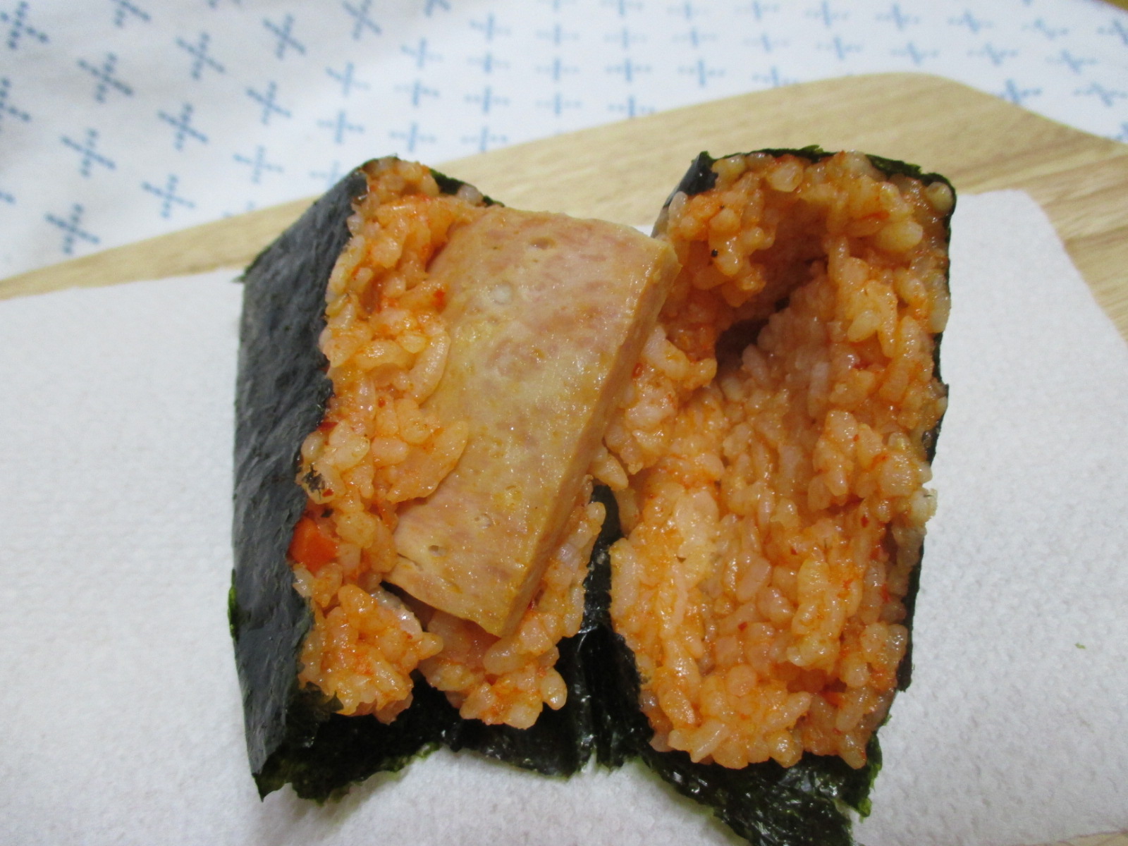 반을 갈라보니 김치볶음밥 속에 스팸이 한 덩이가 들었다.