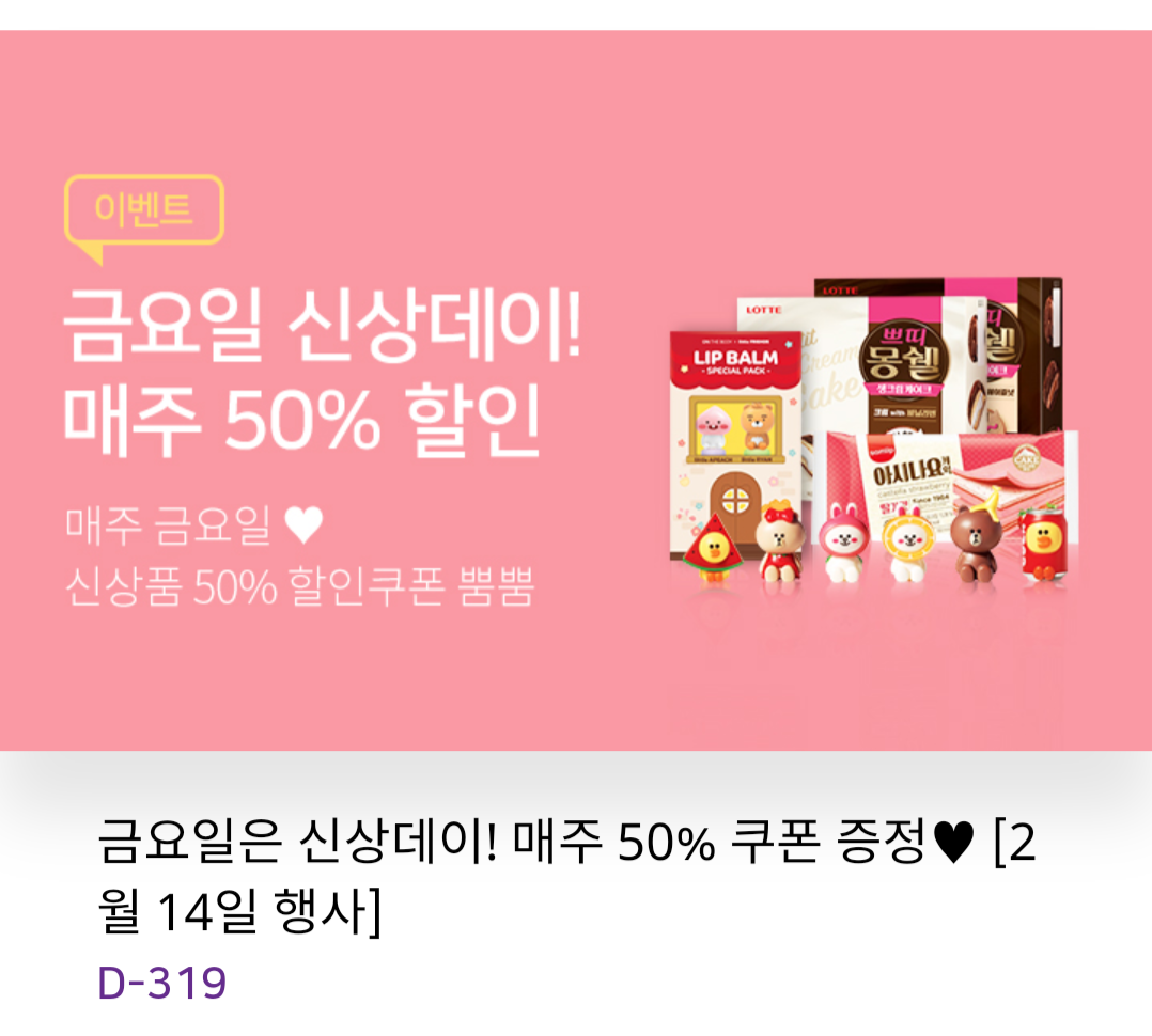 또 다른 요일 이벤트는 '신상데이'라고 해서 매주 금요일 오전 11시에 신상품 50% 할인쿠폰을 1만장 선착순 발급합니다. 쿠폰의 유효기간은 발급일로부터 30일입니다.