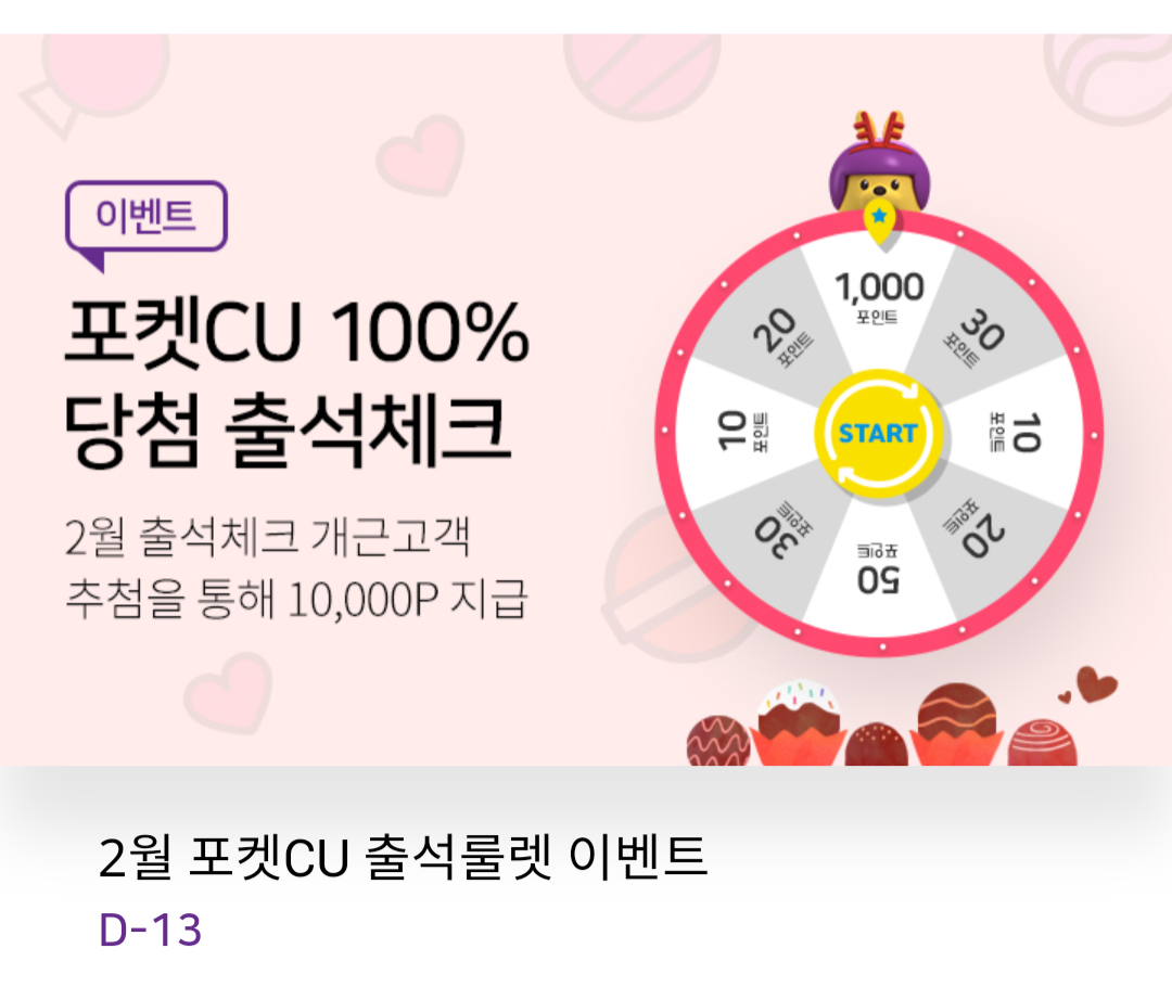 상시 이벤트로는 날마다 참여가 가능한 '100% 당첨 출석체크'라고 해서 룰렛을 돌려 10점에서 1,000점 내에서 포인트를 지급합니다. 그리고 한 달 동안 개근한 고객을 대상으로 추첨을 통해 100명에게는 10,000포인트를 추가 지급합니다.