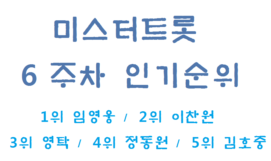 마지막 6주차 투표는 20일부터 23일까지 진행되었으며 결과는 '1위 임영웅 씨, 2위 이찬원 군, 3위 영탁 씨, 4위 정동원 군, 5위 김호중 씨' 입니다.