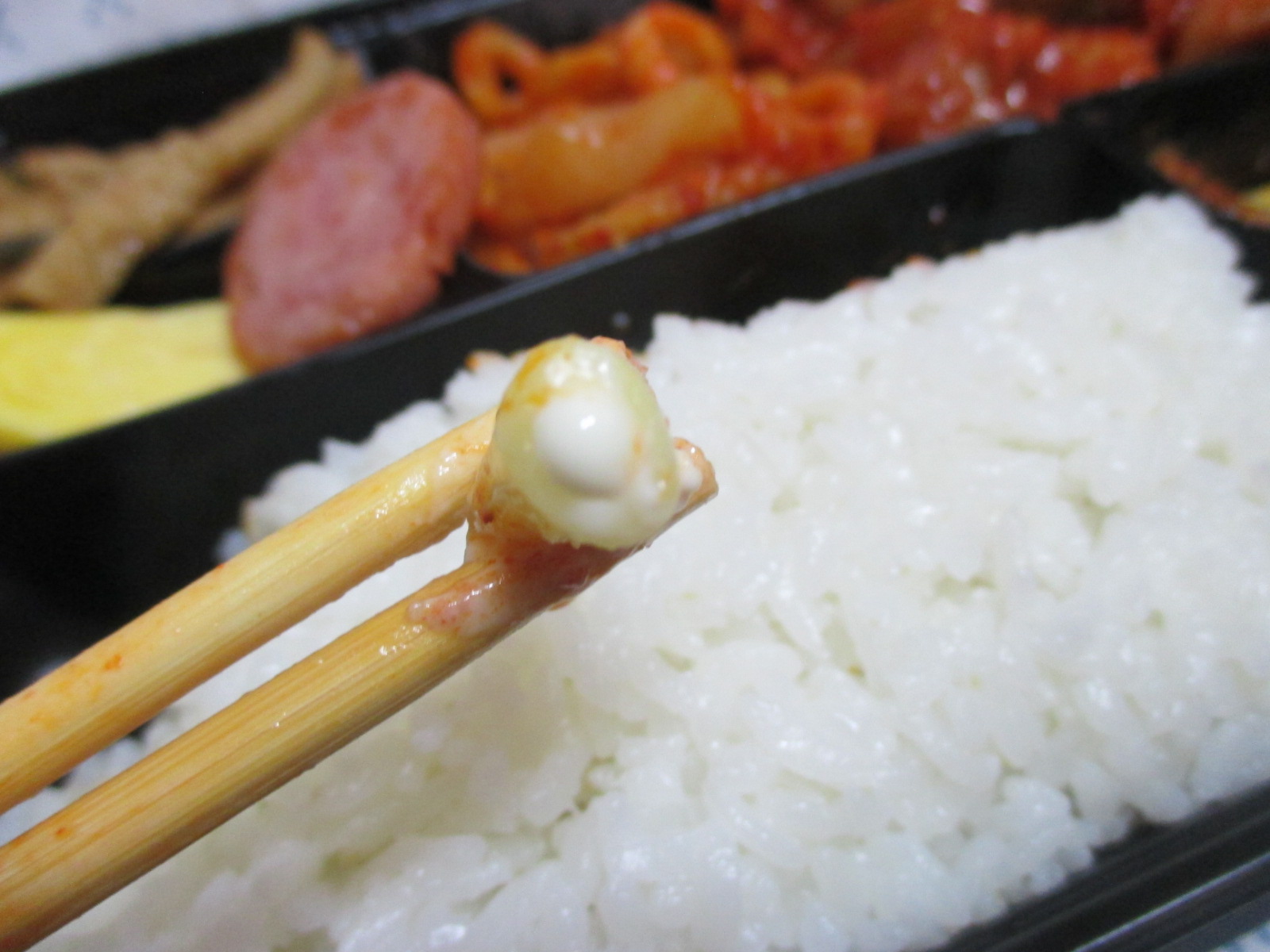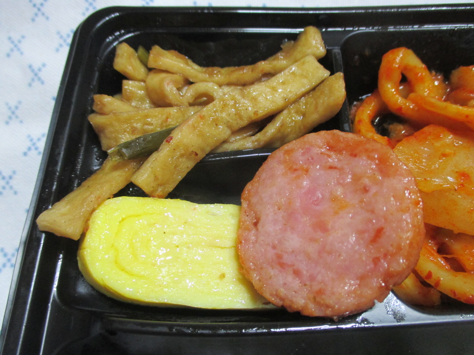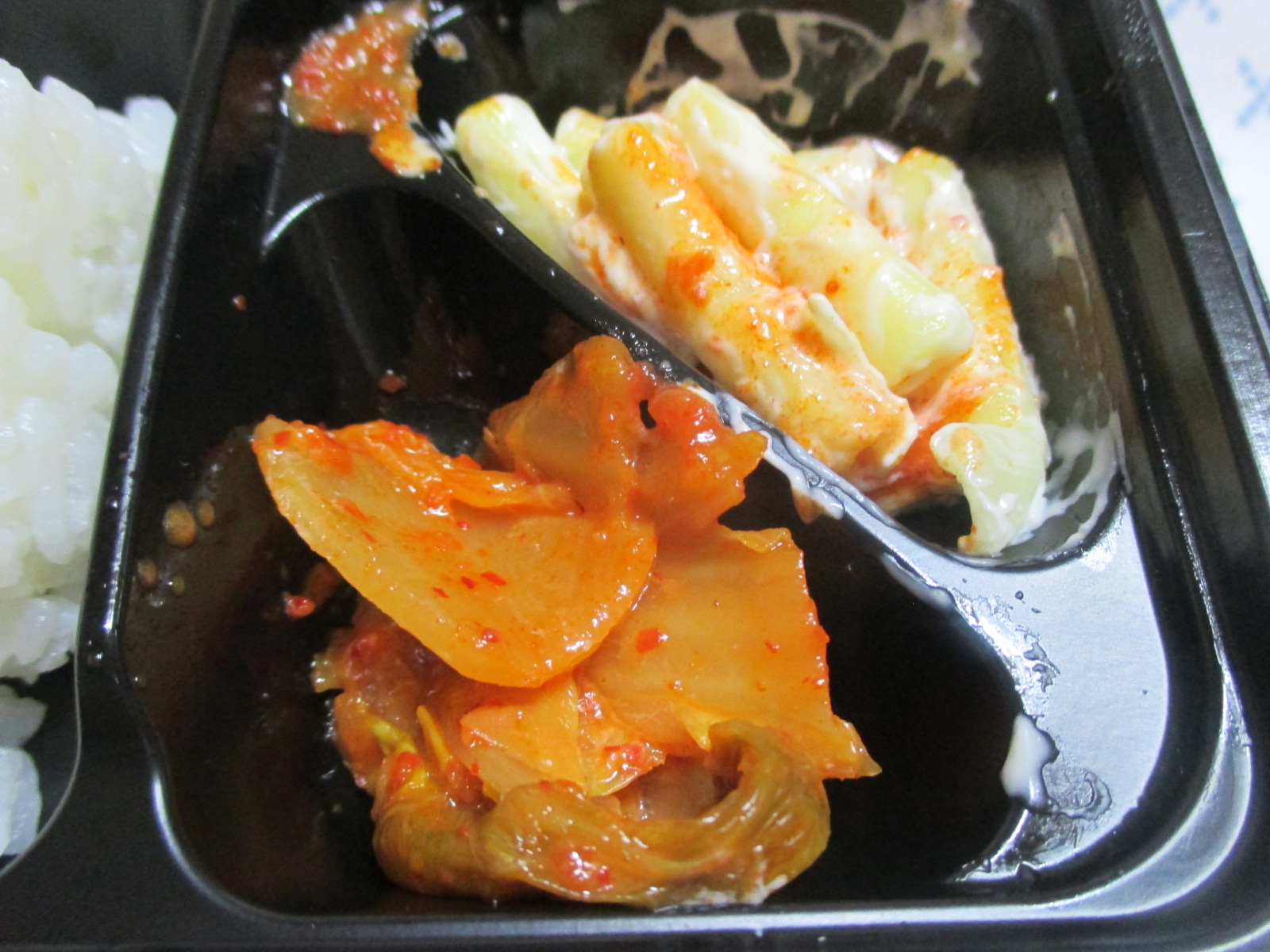 어묵볶음의 식감은 꼬들꼬들함과 질김, 그 중간쯤으로 간은 짭쪼름했는데, 제 입맛엔 맞지 않아서 먹다가 남겼고요, 소시지도 별 맛 없었고, 계란말이는 부드러웠지만 뻑뻑했어요. 김치볶음도 시큼하니 살짝 거부감이 들었어요. 밑반찬 중에선 유일하게 마카로니 샐러드만이 먹을만 했어요. 저는 마카로니 샐러드를 그다지 좋아하지 않는데, 이건 여지껏 먹어본 마카로니 중 가장 색달랐어요.