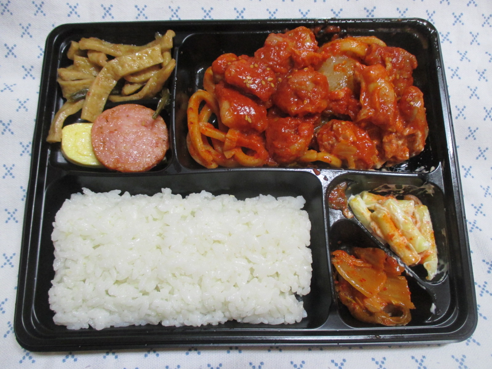 흰쌀밥, 김치볶음, 마카로니 샐러드, 소시지, 계란말이, 어묵볶음, 그리고 메인인 닭갈비와 우동사리가 들었어요.