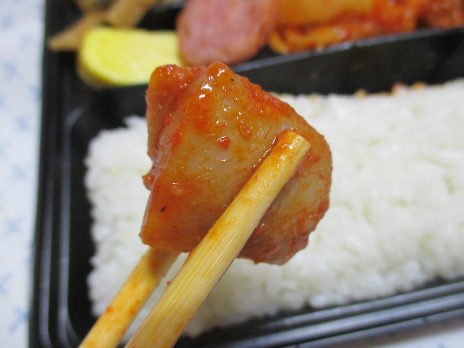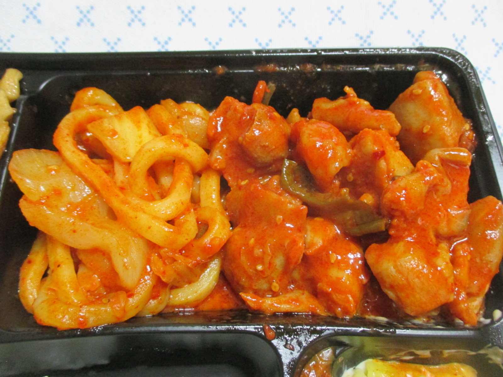 닭갈비는 브라질산이라고만 쓰여 있고, 어디 부위인지는 쓰여 있지 않았지만, 닭다리살인 것 같은데, 굉장히 부드러우면서도 쫄깃했어요. 양념은 살짝 매콤하니 간이 딱 알맞았어요. 매움의 강도는 제 기준으론 약하긴 했어도 전체적인 간이 잘 맞아서 아쉽단 생각은 들지 않았어요. 매운 걸 잘 못드시는 분들에겐 다소 매우실지도 모르겠는데, 어묵볶음, 소시지, 계란말이, 마카로니 샐러드 등 밑반찬들이 죄다 매운맛을 상쇄시켜 주기에 적당한 것들이라 누구나 무난하게 즐기실 수 있을 것 같아요.