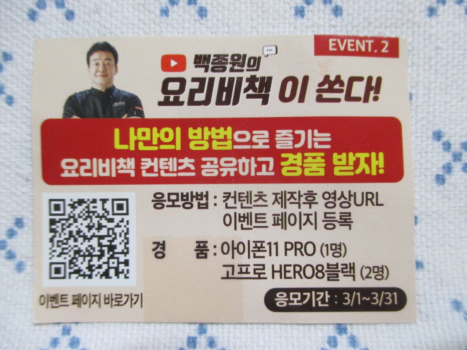 요리비책 첫 번째 이벤트는 요리비책 시리즈 7종 중 하나를 드신 다음 영수증 하단에 있는 20자리 번호를 이름, 생년월일, 휴대폰번호와 함께 이벤트 페이지에 등록하기입니다.