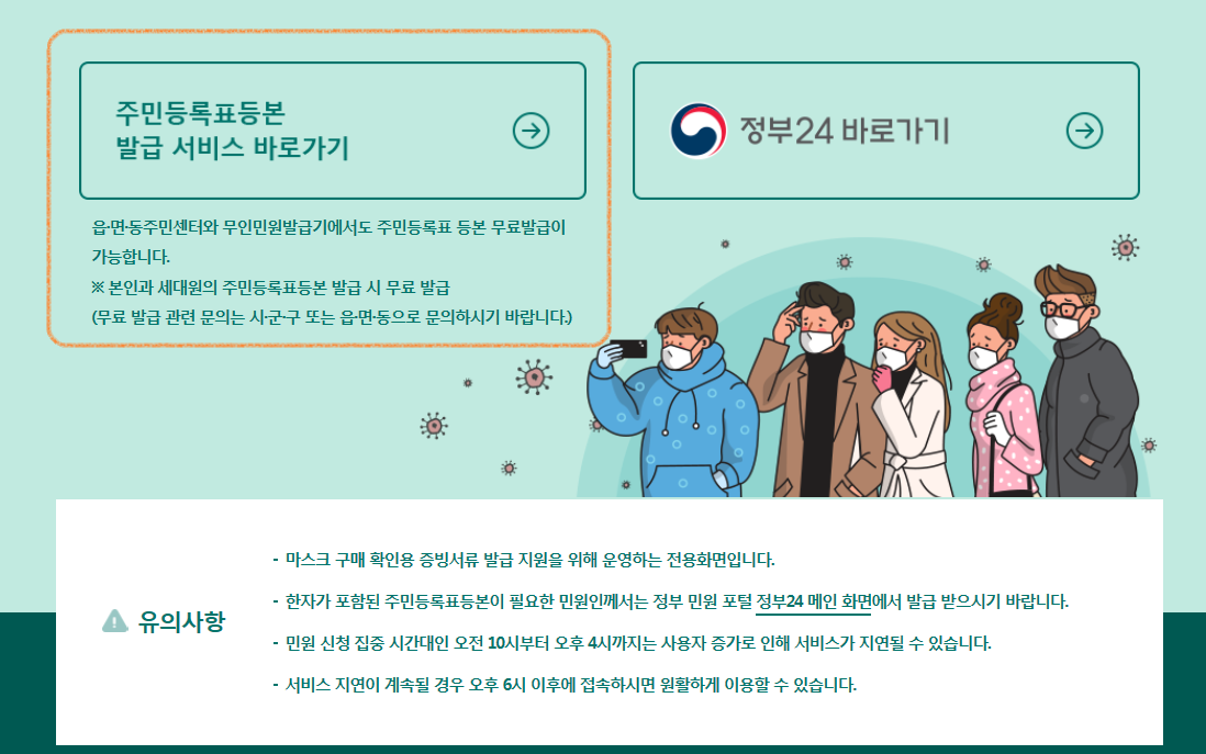가족 중에 장애인이나 장기요양급여 수급자, 만 10세 이하 어린이, 만 80세 이상 어르신이 있는 경우 대리 구매도 가능합니다만, 대리 구매 시에는 꼭 지참해야 할 서류들이 있습니다. 그중 하나가 주민등록등본인데요, 이는 '정부24'에서 무료 발급이 가능합니다.