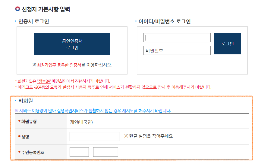 저는 비회원 가입으로 진행해 보았는데요, 비회원 로그인 시에는 이름과 주민등록번호를 입력하신 다음 이용약관에 동의를 해야 다음 페이지로 넘어갈 수 있습니다.