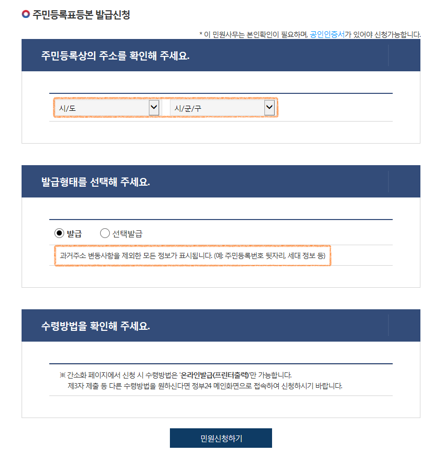 다음에는 주민등록상의 주소와 같게 '시/도'와 '시/군/구'를 설정해 주고, 발급 형태 중 '발급'에 체크를 한 다음 맨 하단의 '민원신청하기'를 누릅니다. 주민등록등본에는 대리 구매인과 대리구매 대상자의 주민번호가 모두 나와야하므로 꼭 '발급'에 체크해 주세요.