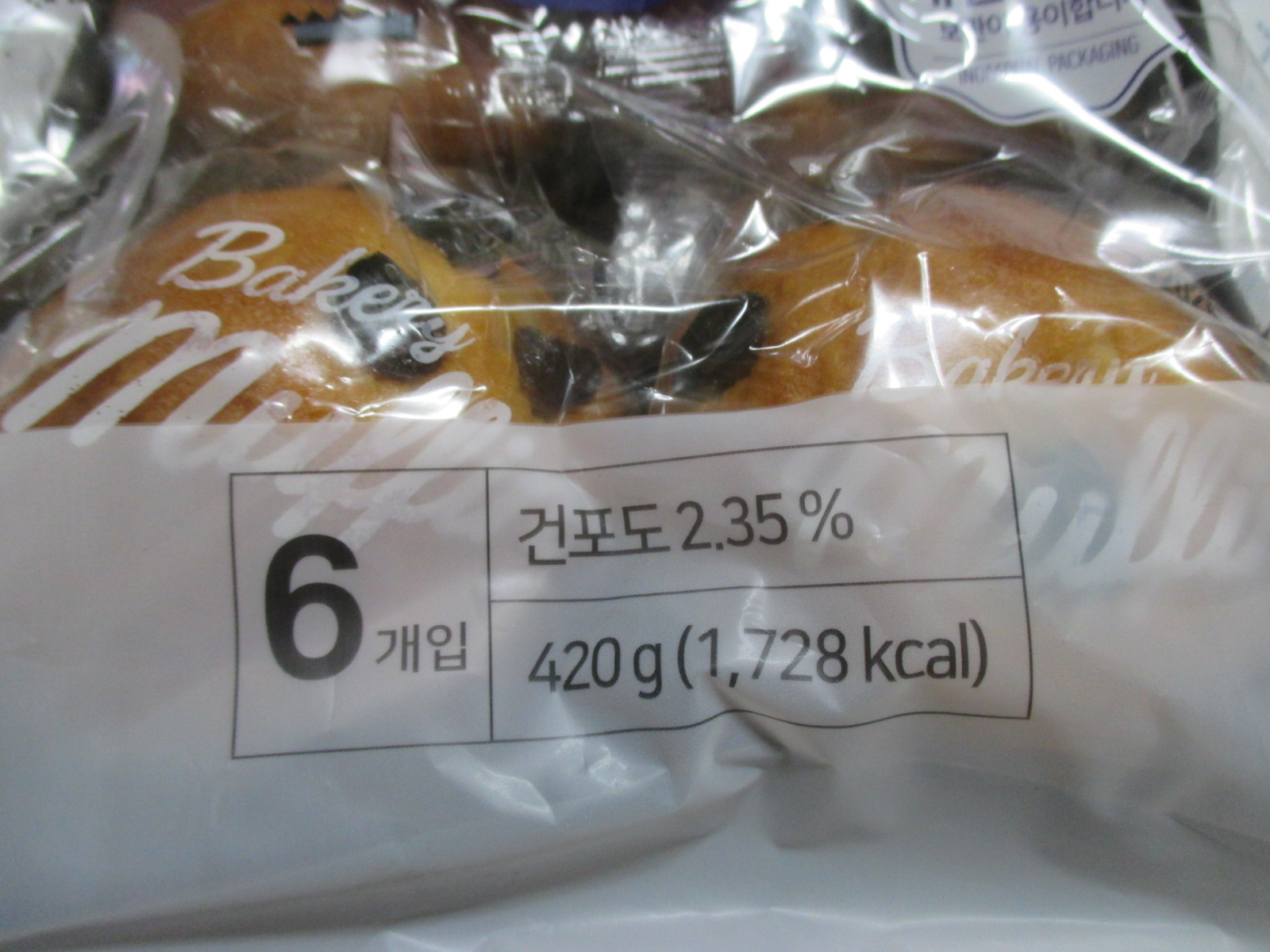 삼립 촉촉한 건포도 머핀은 6개입으로 총 420g에 1,728kcal이고, 건포도가 2.35% 함유되었어요.