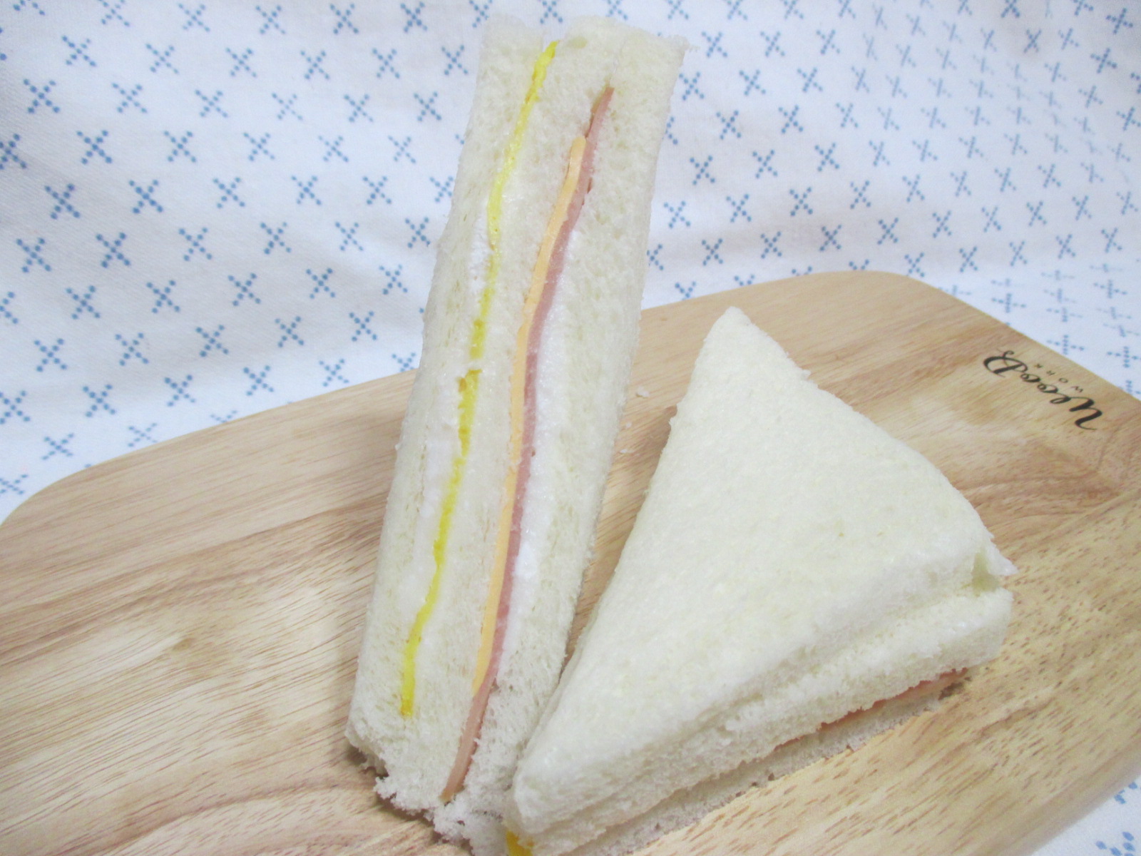 식빵이 중간에 하나 더 들어갔고, 사이사이에 스모크햄, 슬라이스치즈, 계란지단, 그리고 연유크림이 들어가 있습니다.