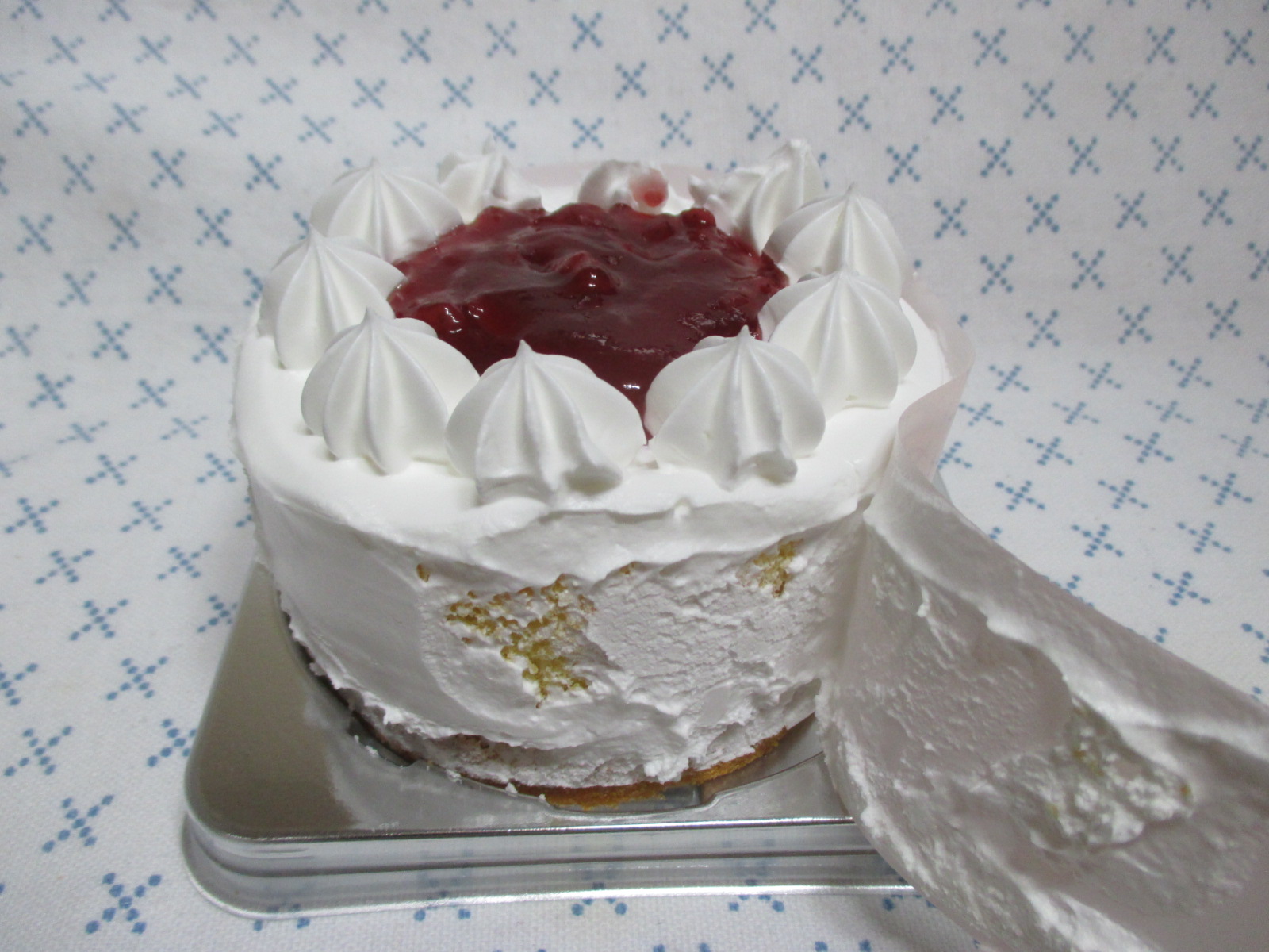 케이크의 둘레에는 생크림이 케이스에 묻지 않고, 모양이 흩으러지지 않도록 띠지가 둘러져 있으므로 드시기 전에 제거해 주세요.