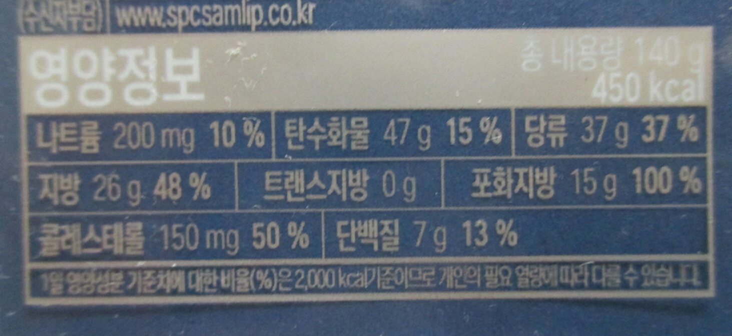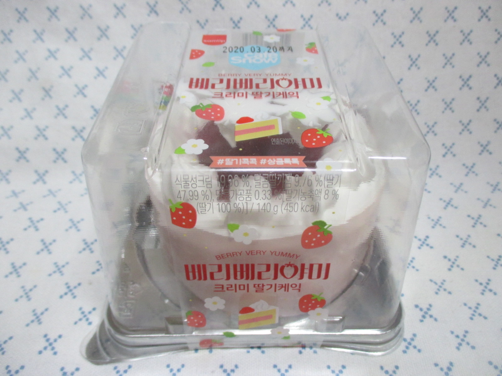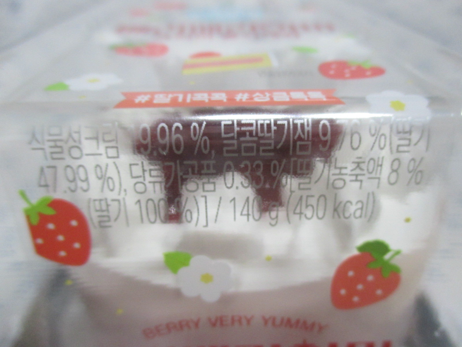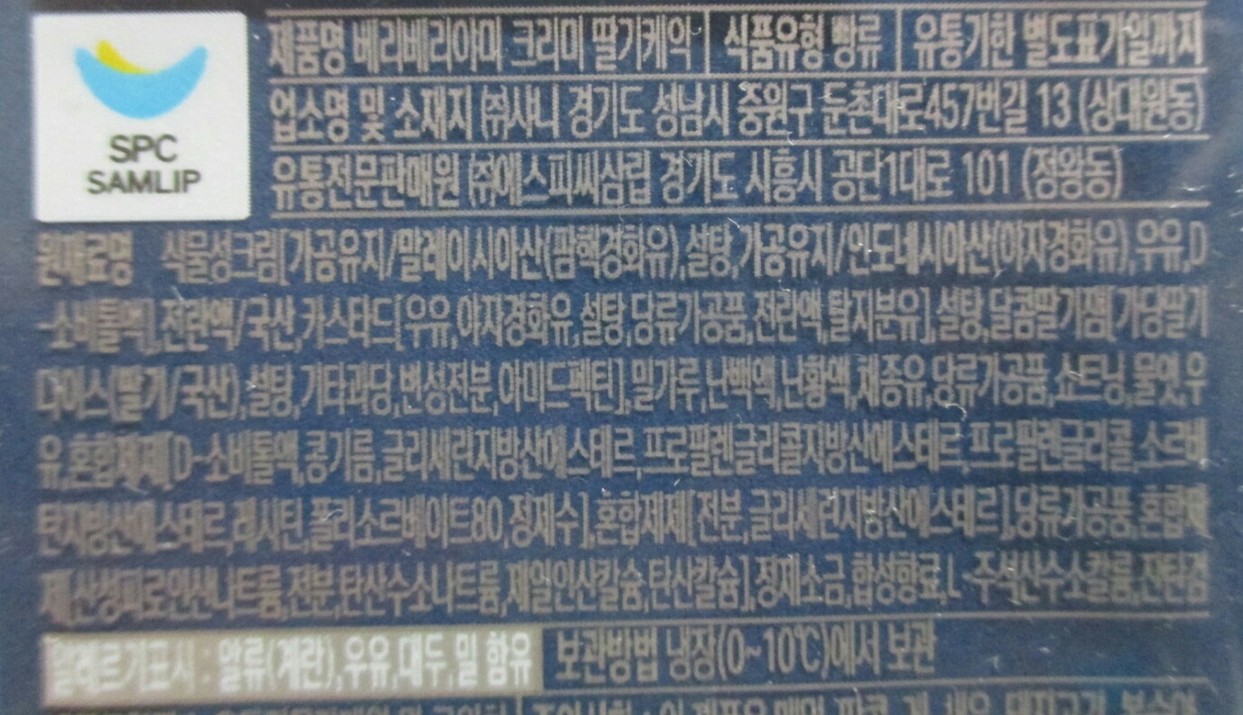 '베리베리야미 크리미 딸기케익'의 총 중량과 열량은 140g에 450kcal이고, 식물성크림 19.96%, 달콤딸기잼 9.76%(딸기 47.99%), 당류가공품 0.33%[딸기농축액 8%(딸기 100%)] 등이 함유되었으며, 가격은 4,500원입니다.