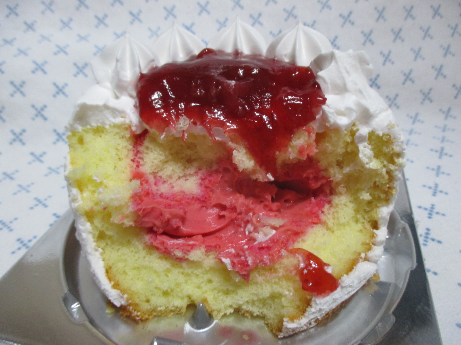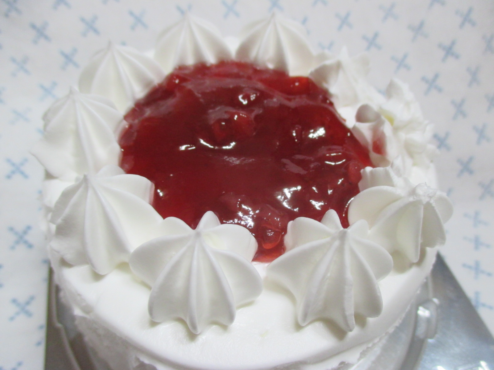 딸기 케이크임을 한 눈에 알 수 있는 딸기잼이 가운데 듬뿍!