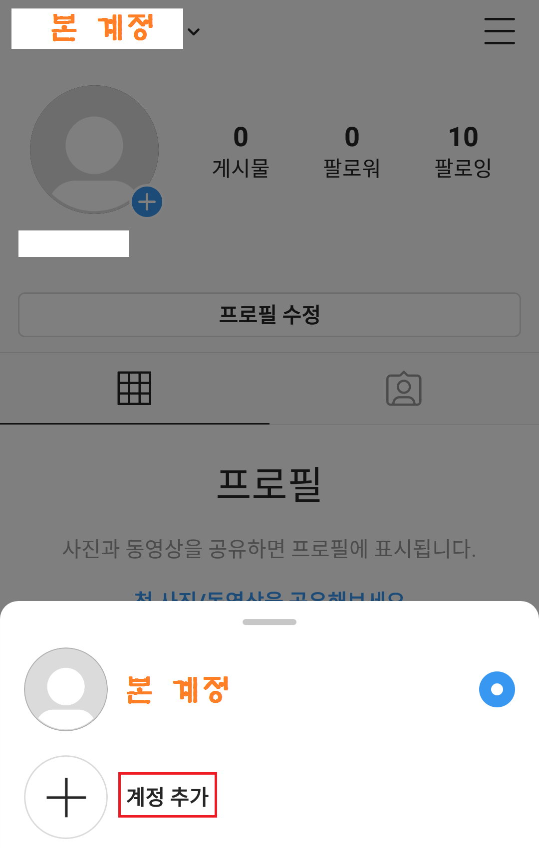 이미 만들어 놓으신 인스타 계정이 여러 개라면 그중에서 본계로 사용중인 계정을 선택하신 후에 다음 절차를 진행하시면 됩니다. 위의 경우처럼 계정이 하나밖에 없을 때는 바로 '계정추가'를 누르시면 되시고요.