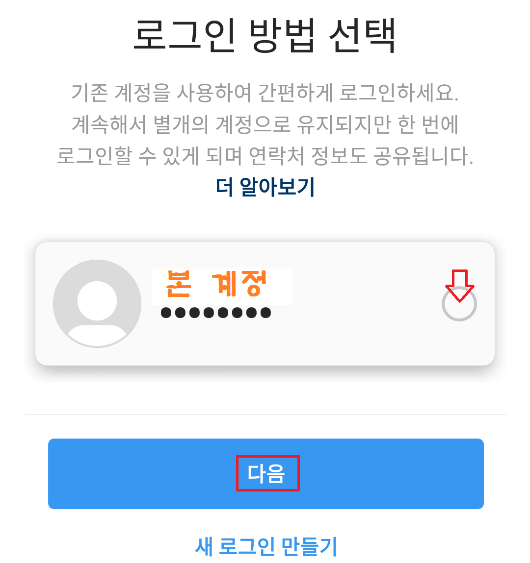 본계정을 선택하신 후 '다음'으로 넘어가면 본계정 밑으로 부계정이 만들어집니다. 그리고 '새 로그인으로 만들기'를 선택하시면 단일계정을 생성하실 수 있습니다. 이때 부계정을 만든다고 할 때 유의할 점이 있는데요, 예를 들어 지인들과의 소통용으로 본계정을 사용중이고, 지인들 모르게 사용할 목적으로 부계정을 만들려고 하는 거라면, 본계정을 어떻게 만들었느냐를 알아봐야 합니다.