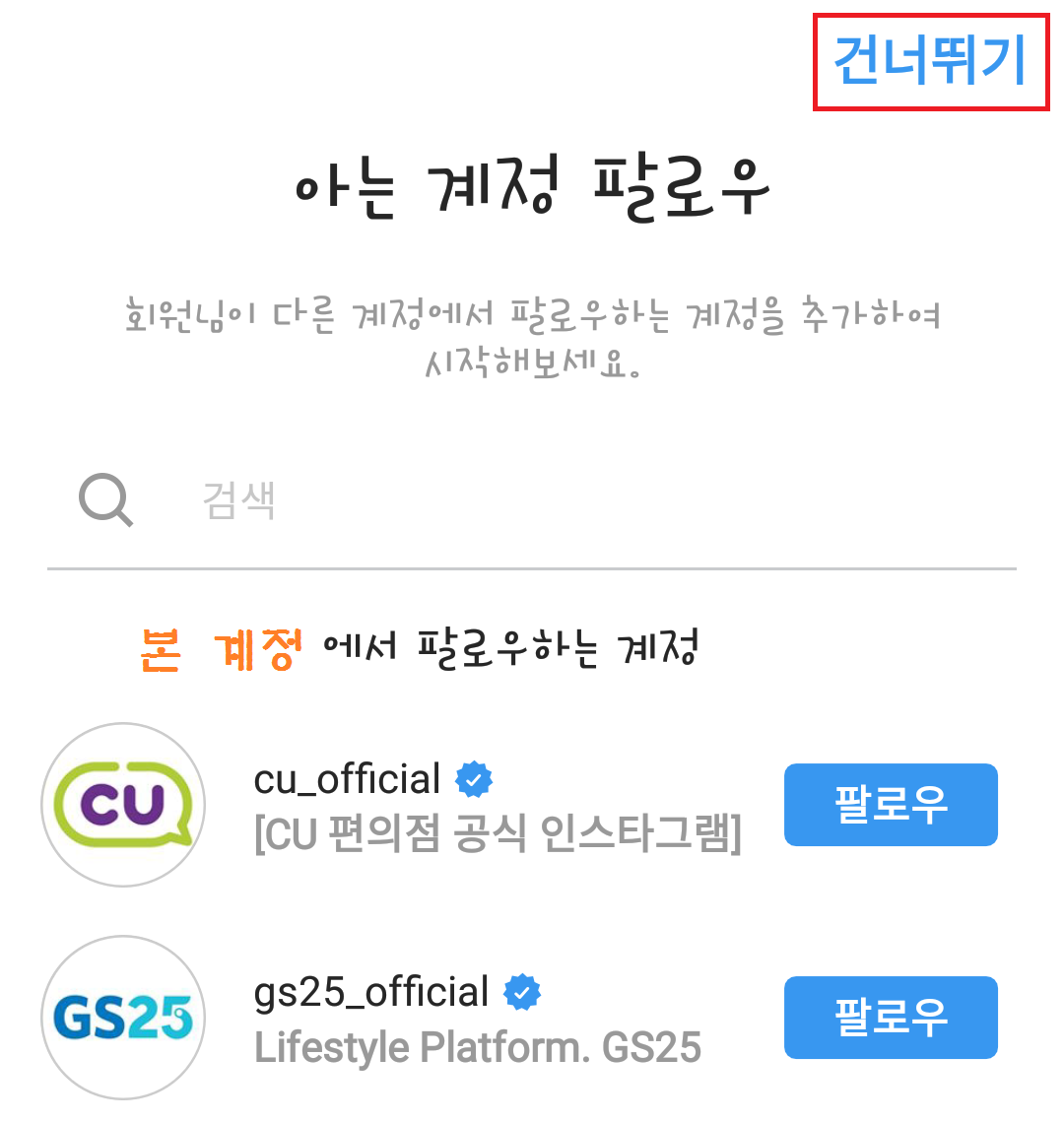 본계정을 전화번호가 아닌 이메일로 만들었고, 연락처 동기화가 되어 있지 않아도 부계정을 만들면 내가 본계정에서 맺은 팔로우들이 보이는데, 이는 나에게만 보이는 것이니 안심하셔도 됩니다. 설령 맞팔을 맺은 상대에게 내 계정이 뜬다해도 상대는 그것이 나의 부계정임을 알 수 없습니다. 그러니 '아는 계정 팔로우'에 지인(본계정에서 팔로우한)이 뜨더라도 놀라지 마시고 '건너띄기' 하세요.
