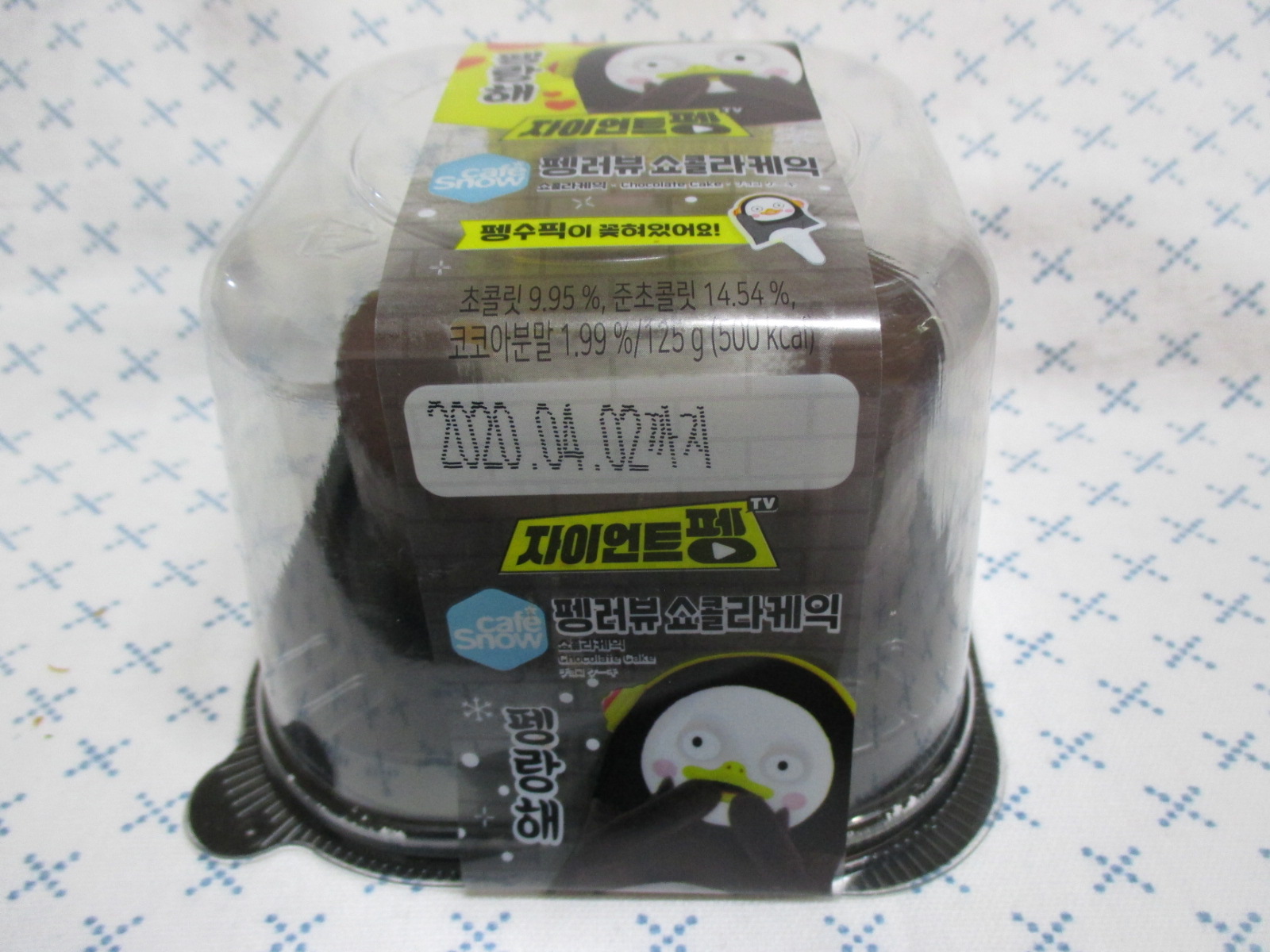 펭러뷰 쇼콜라 케익의 총 중량과 열량은 125g에 500kcal로, 초콜릿 9.95%, 준초콜릿 14.54%, 코코아분말 1.99% 등이 함유되었으며, 가격은 5,500원입니다.