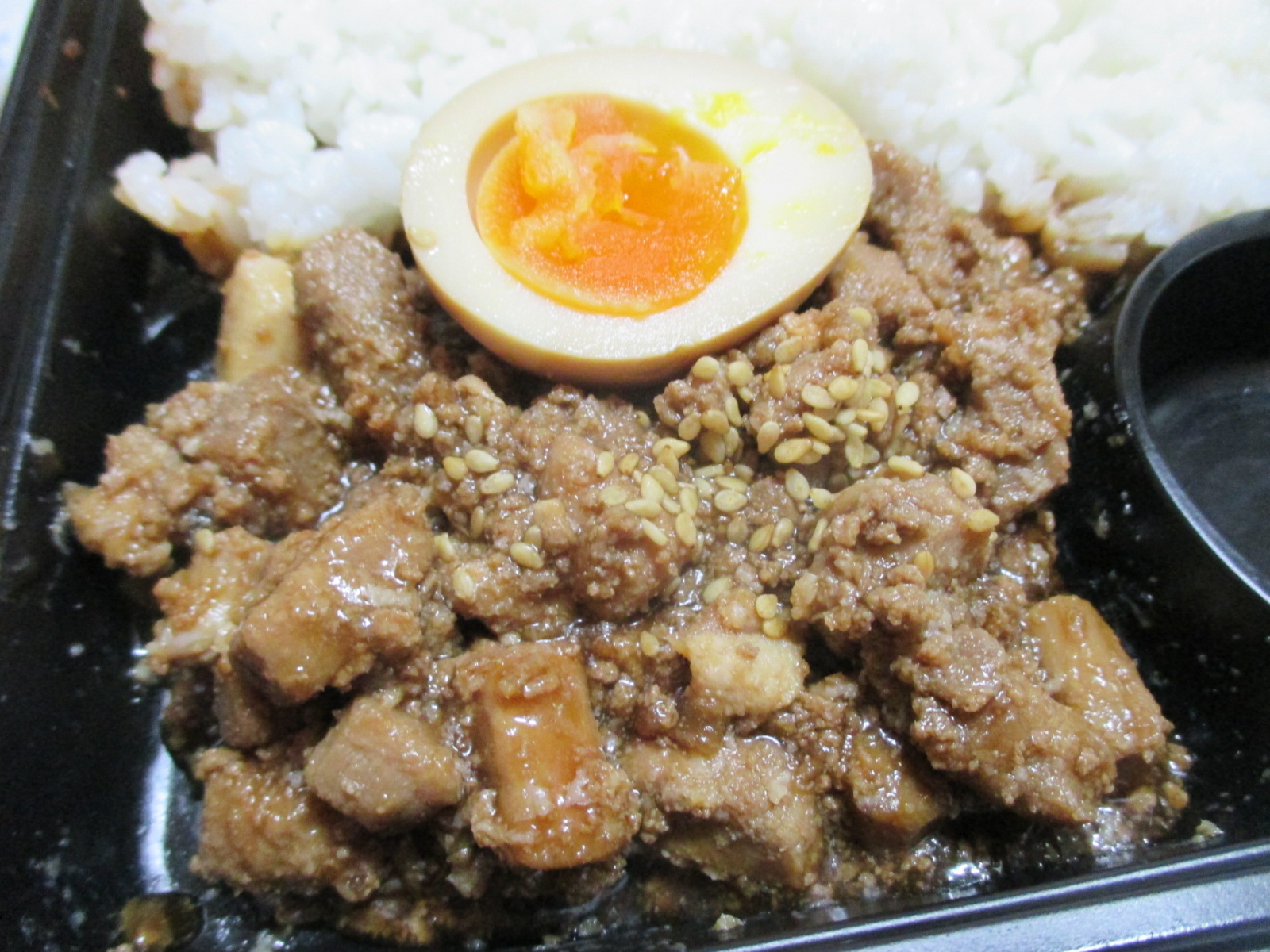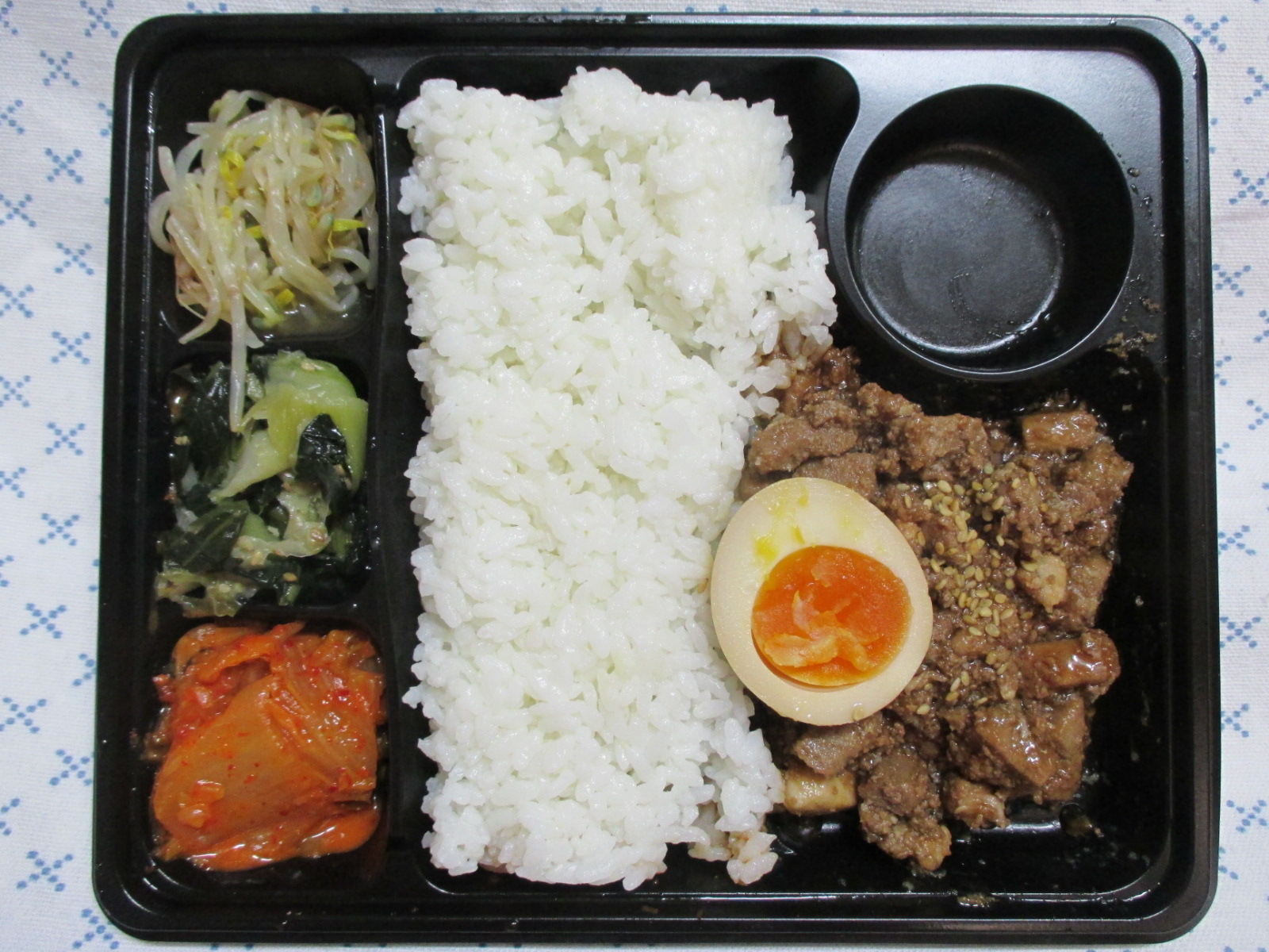 밥, 돼지고기, 반숙 달걀 장조림 반쪽, 김치볶음, 청경채무침, 콩나물무침 그리고 소스가 들었어요.