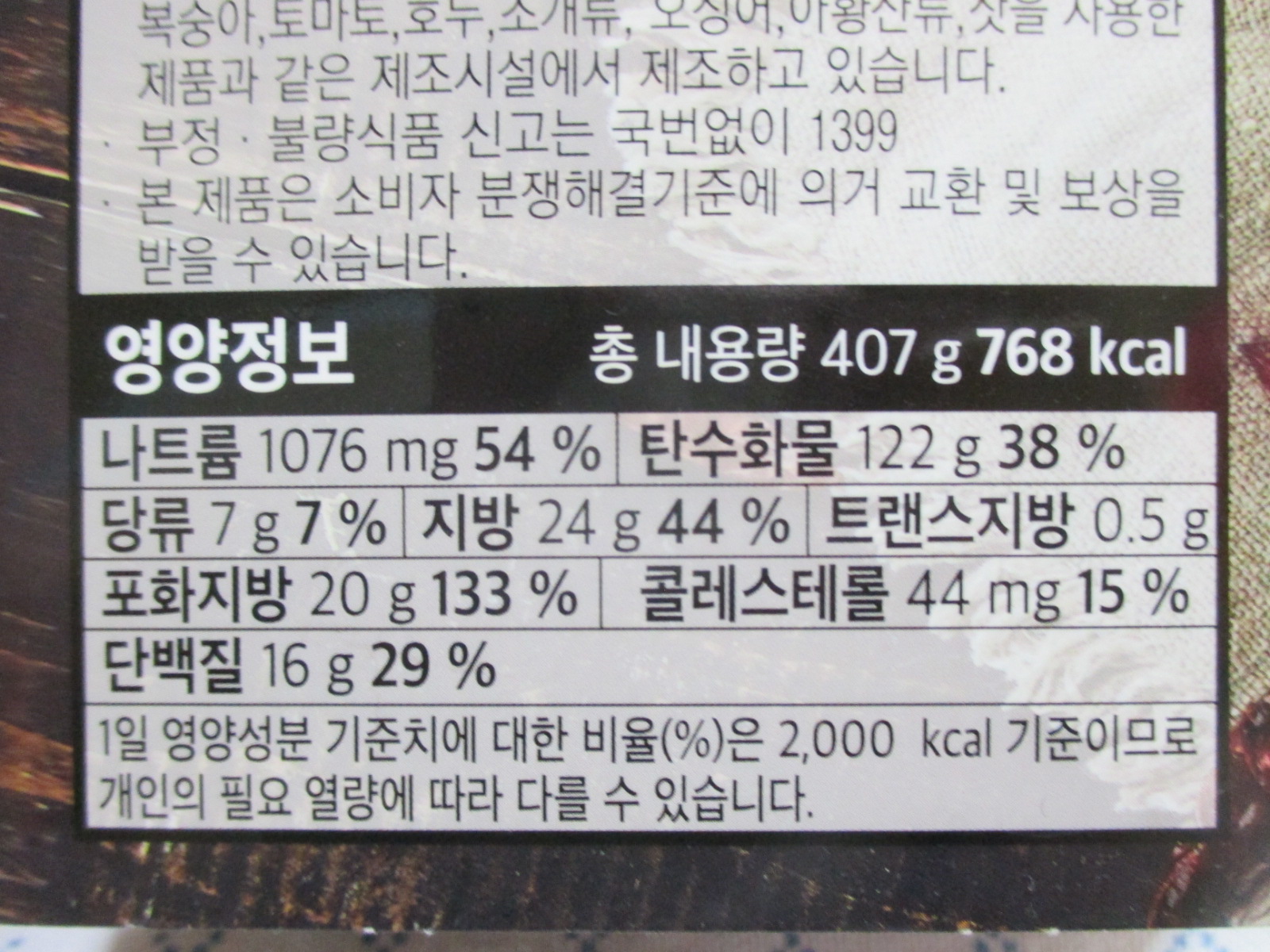 총 중량과 열량은 407g에 768kcal이며, 매콤크림소스[우유 30%, 양파 6.5%, 새송이버섯 5%, 마늘 2%] 56.4%, 쫄면사리 39.3%, 도전 앵그리소스 3.7% 등이 함유되었어요.