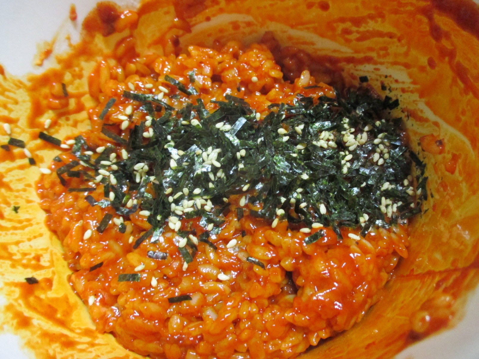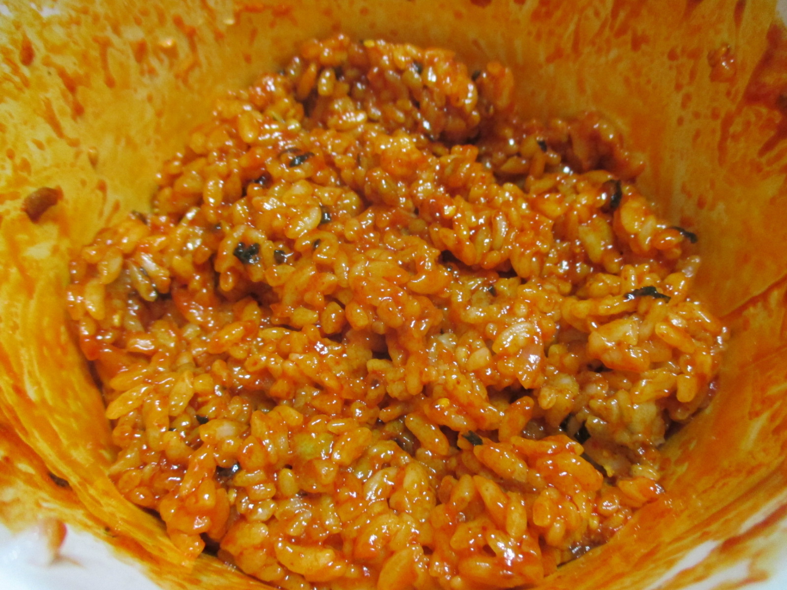 용기에 전자레인지에 데운 밥과 불닭소스, 그리고 마요네즈와 김깨가루를 넣고 쓱쓱 비벼줍니다.