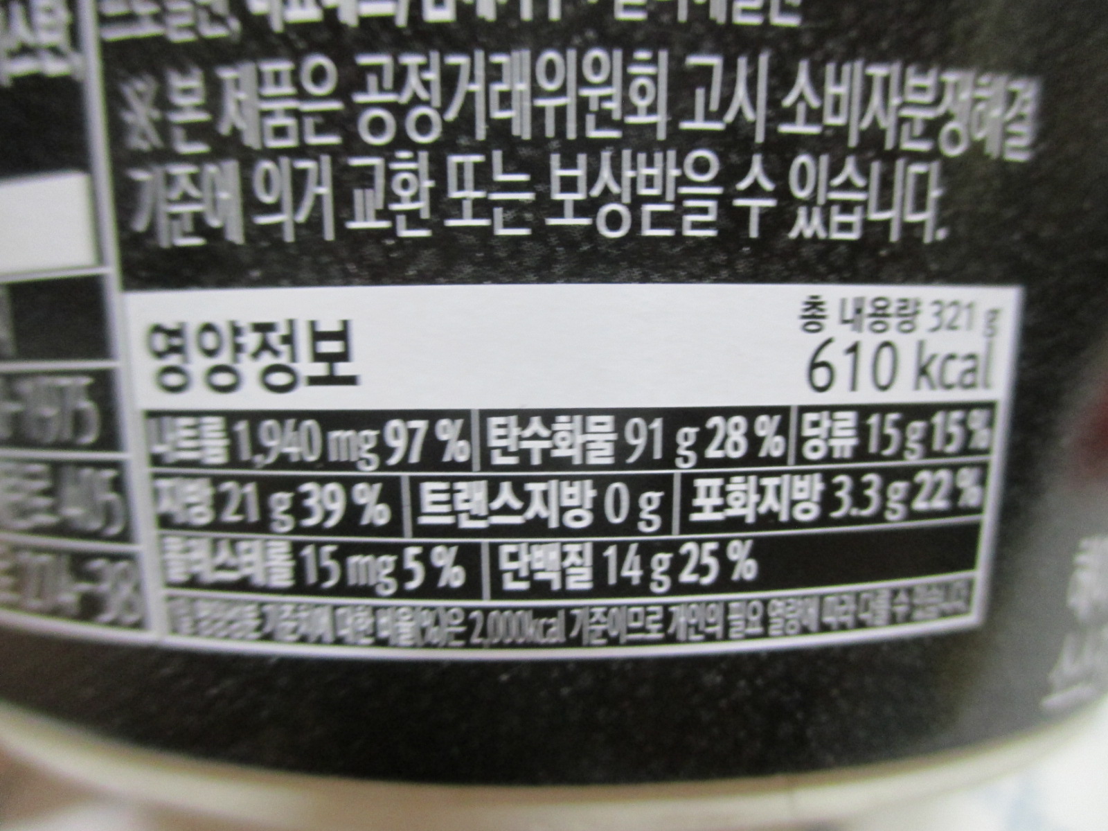 총 중량과 열량은 321g에 610kcal이며, 보다 자세한 영양정보는 위 이미지를 참고 바랍니다.