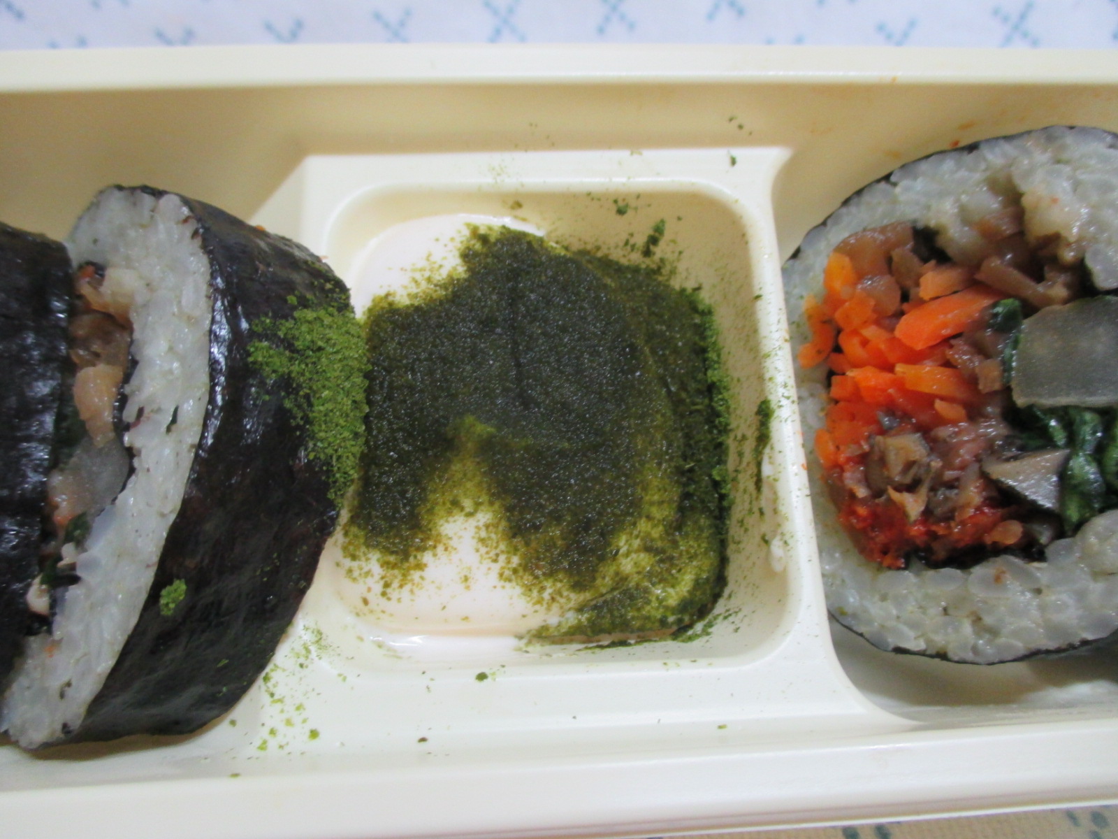 케이스는 세 칸으로 나뉘어 있는데, 양 사이드에는 김밥이 4개씩 들었고, 가운데에는 고운 입자의 감태가루가 뿌려진 마요네즈가 들었어요.