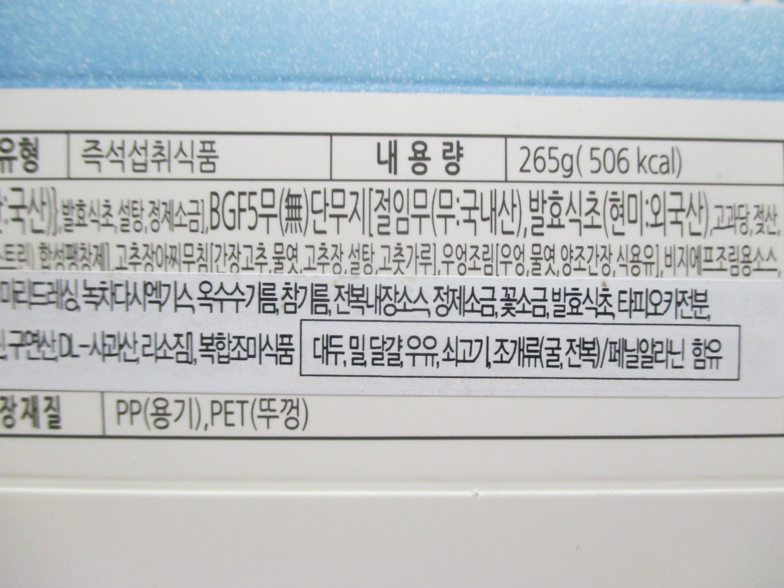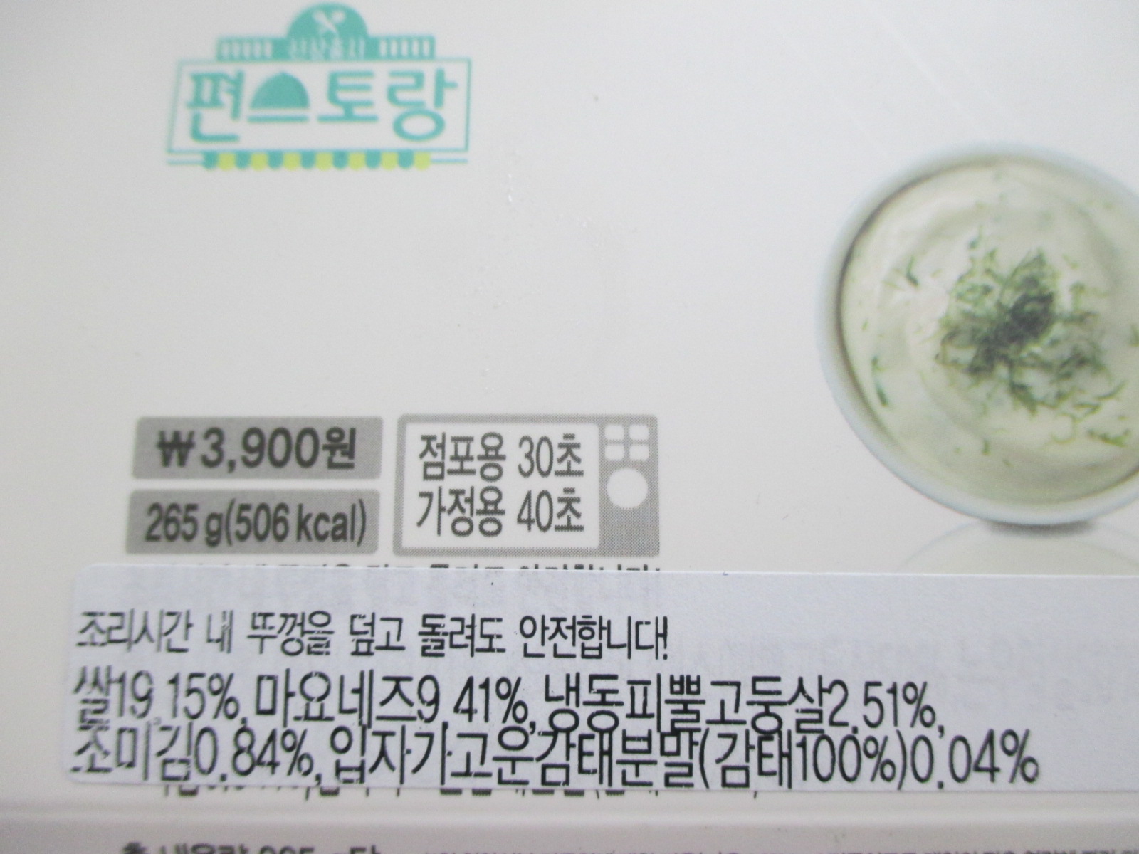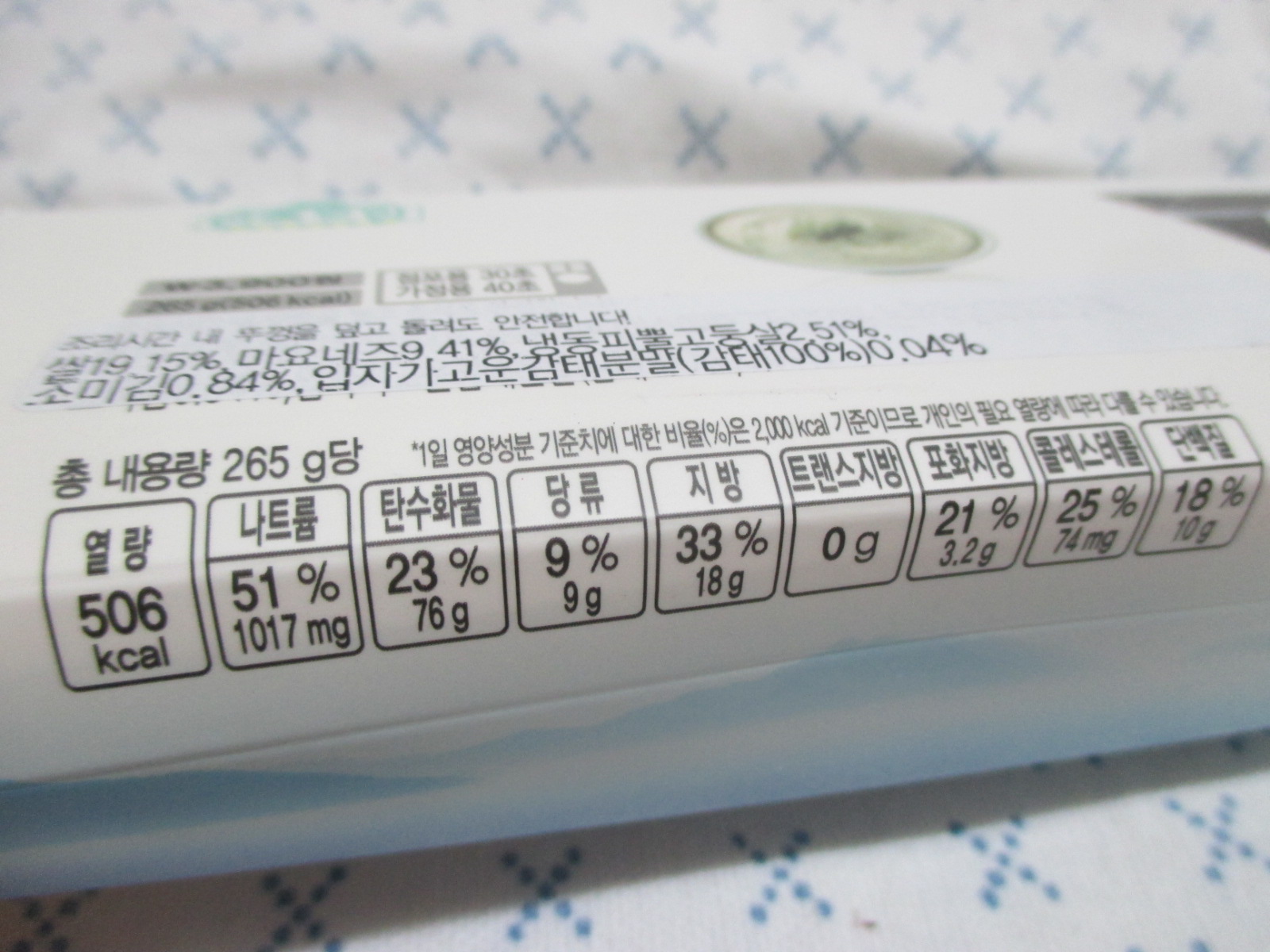 총 중량과 열량은 265g에 506kal이며, 쌀 19.15%, 마요네즈 9.41%, 냉동피뿔고둥살 2.51%, 조미김 0.84%, 입자가고운감태분말(감태100%) 0.04% 등이 함유되었어요.