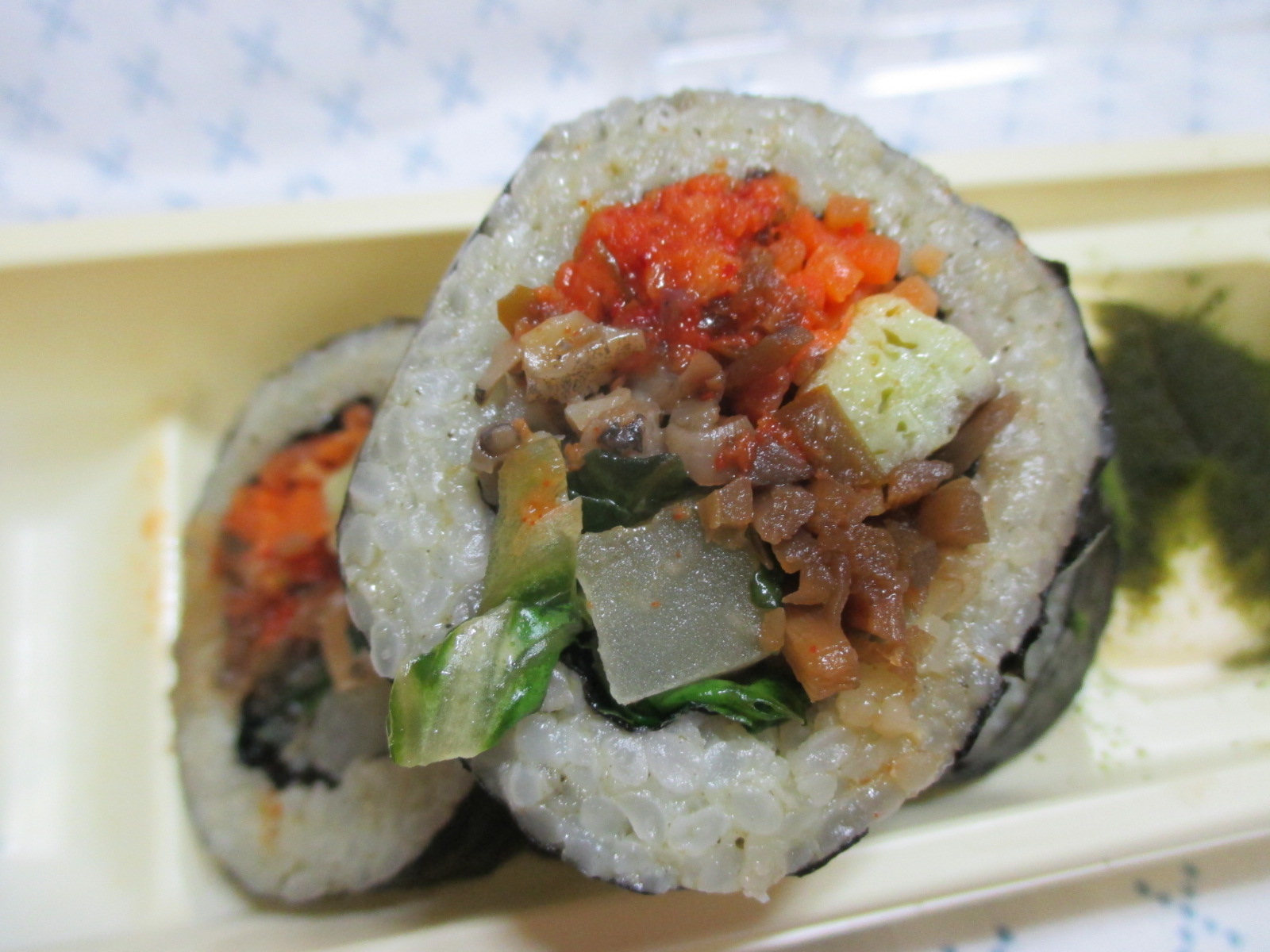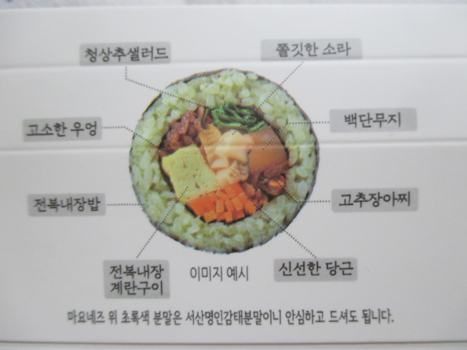 소라감태마요김밥은 일반 김밥처럼 조미김 위에 전복내장밥을 올리고 그 위에 우엉, 청상추샐러드, 백단무지, 고추장아찌, 당근, 전복내장 계란구이 그리고 주인공인 소라를 올려 돌돌 만 것으로, 집에서도 손쉽게 만들 수 있어요. 다만 재료의 한계가... 전복내장은 패쓰해야 할 듯요. 전복내장을 넣을 거면 애초에 전복감태김밥을 만들어야지요.ㅎㅎ
