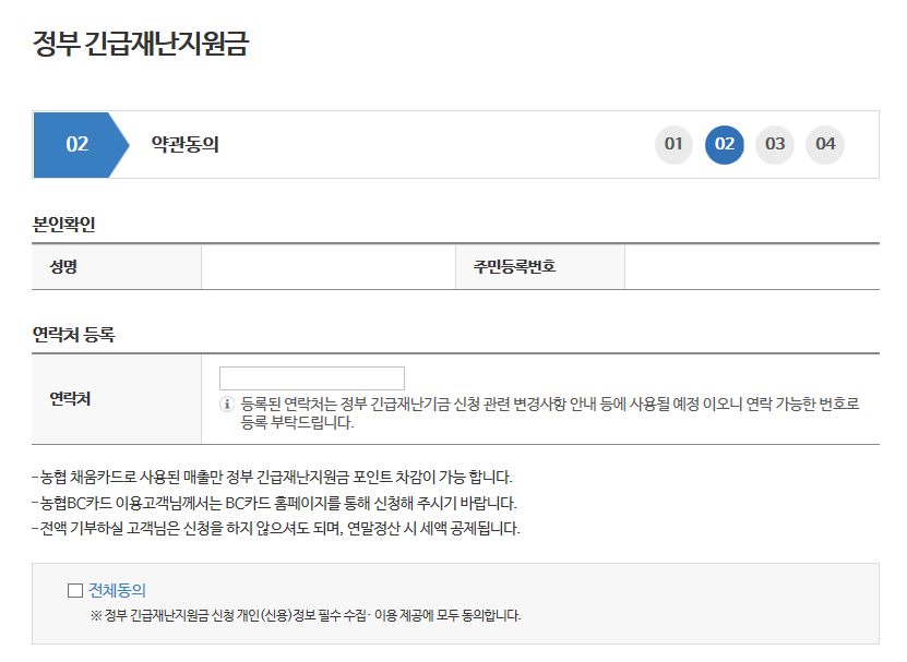 휴대폰 인증을 마친 다음엔 약관동의로 넘어가는데 온라인 신청 첫 날 이 부분에서 약관 내역을 제대로 읽지 않고 전체 동의를 하여 재난지원금 전액이 기부로 처리되었다는 일이 있었다기에 꼼꼼히 확인해 봤는데, 이미 문제점이 보완된 건지 아님 NH농협카드는 처음부터 문제가 없었는지는 몰라도 기부와 관련된 사항은 없었습니다. 따라서 안심하고 전체동의에 체크를 하신 후 넘어가시면 되겠습니다.