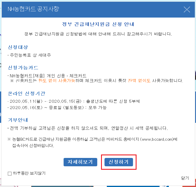 농협카드 홈페이지에 처음 접속하면 따로 긴급재난지원금 신청 항목을 찾을 필요없이 신청 안내 팝업창이 바로 뜹니다. 여기서 제일 하단의 '신청하기'를 클릭해주세요.