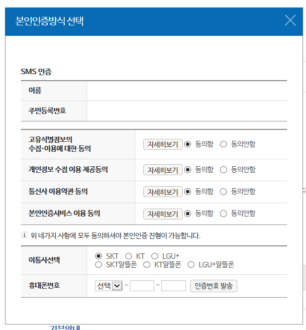 휴대폰 인증은 네 가지 사항에 모두 동의를 해야 인증 진행이 가능하므로, 모두 '동의함'으로 체크한 다음 본인 명의의 휴대폰으로 인증번호를 발송받아 입력해주세요.